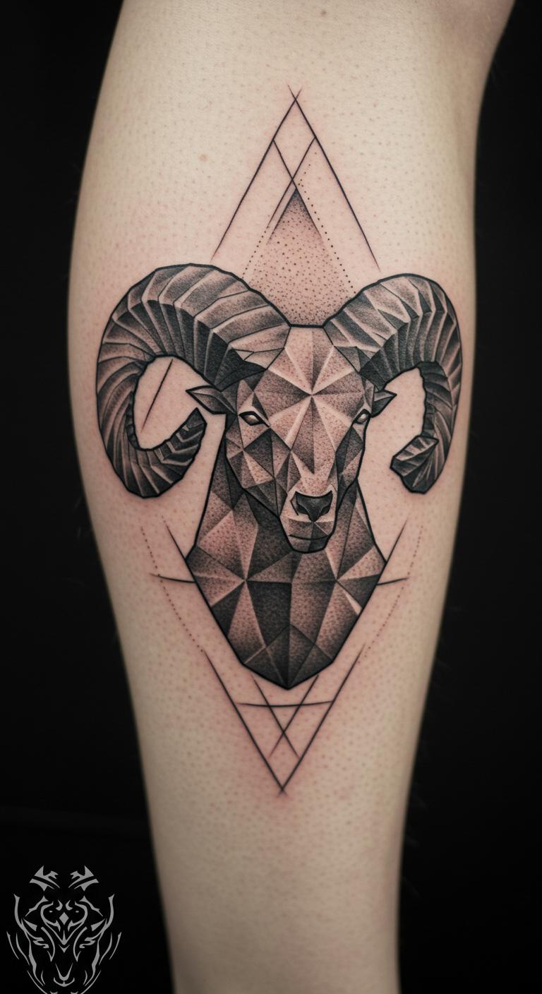 Geometric shapes form a ram on your calf. Use shapes in your designs. Position for strength. Costs about $80. Mix polygons. Build with ruler drawings. This idea is modern. Care with leg lotions. Layer shapes gradually. It’s structured and cool.