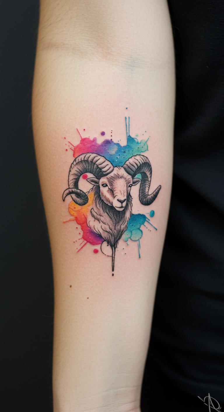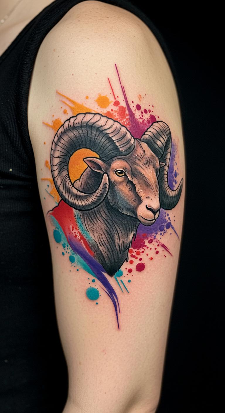 Bursts of color highlight the ram. Add colors in your sketches. Position for pop. Costs around $100. Select bursts wisely. Paint samples at home. This tattoo is lively. Care with color protectors. Build bursts step by step. It’s energetic and eye-catching.