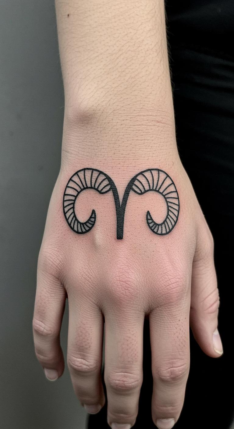 Solid black outlines define Aries simply. Draw bold lines at home. Put it on your hand. Affordable at $30. Keep it classic. Use black markers for mocks. This design is timeless. Protect with gloves. Start with outlines. It’s straightforward and effective.