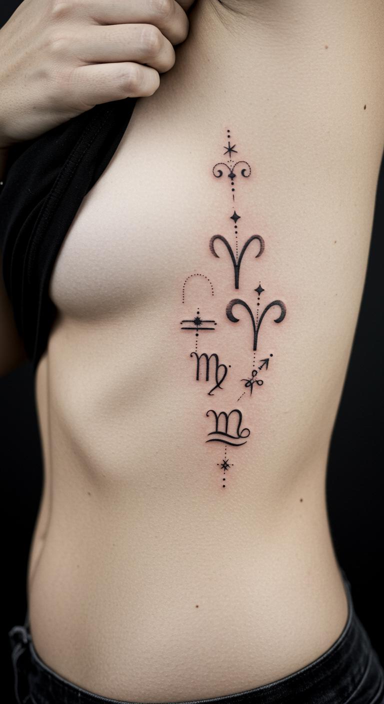 Link Aries to other signs for a story. Connect symbols in drawings. Place on your rib. Budget at $80. Choose signs thoughtfully. Draw connections on paper. This design is narrative. Tend with rib care. Combine signs gradually. It’s meaningful and linked.