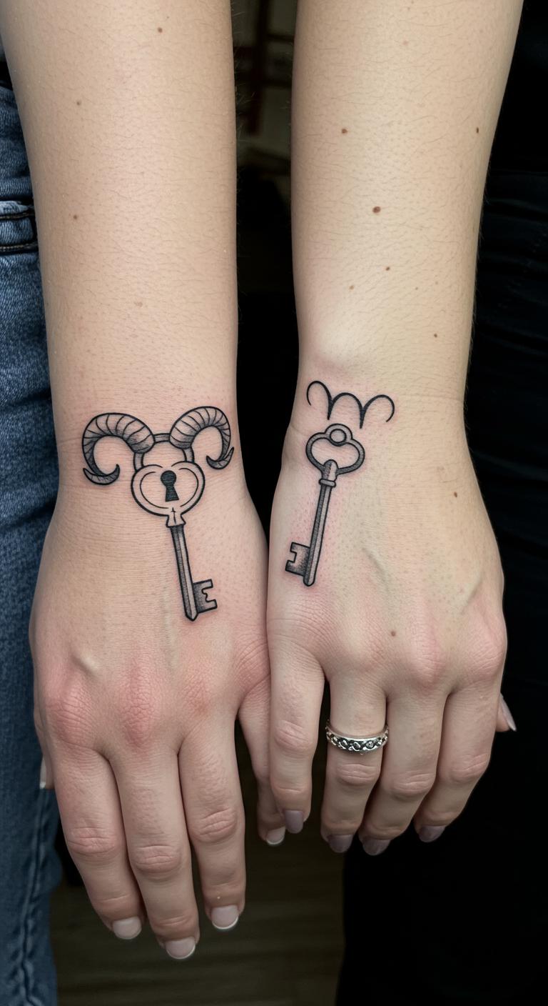 Locks and keys make a great pair tattoo, symbolizing unity with an Aries twist. Use basic shapes in black ink to keep it minimal. Create a template at home using free software on your computer. Get one for each partner at a local spot for about $80 total. Position them on fingers for a discreet bond. Customize by adding a tiny ram to one key. Test ideas by drawing on paper with a marker. This design highlights relationships without overcomplicating things. Use everyday cream for soothing the area. Share the process with a friend for fun. It’s an affordable way to celebrate connections.