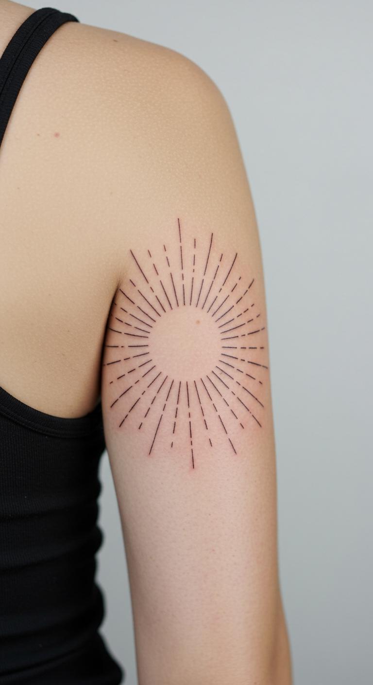 A sun ray burst brightens your back arm. Start with short rays from a center point. Draw on paper to get it right. Artists often quote $70. Print burst designs for home application. Arrange to catch light nicely. Add a center dot for flair. Protect from sun for vibrancy. It warms your presence.