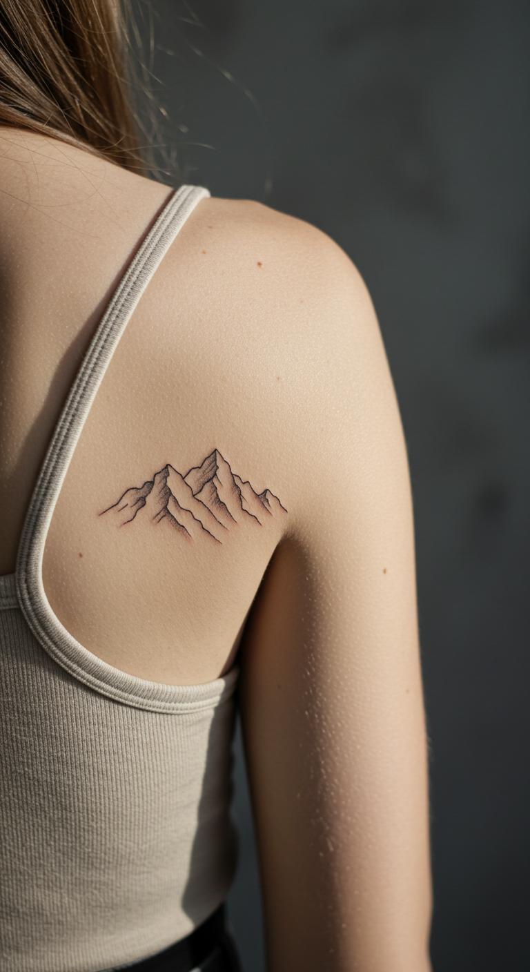 A mountain peak climbs your back arm. Outline a single summit. Visualize on photos. Sessions at $55. Use stencils for trials. Fit to your contour. Add more peaks later. Protect for endurance. It peaks your resolve.