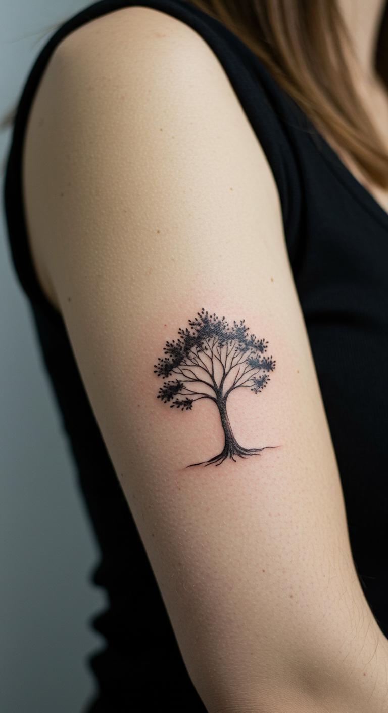 A tree silhouette roots your back arm. Sketch a basic trunk. Preview digitally. Ink around $70. Use templates for DIY. Ground it firmly. Grow branches slowly. Care for growth. It stands tall.