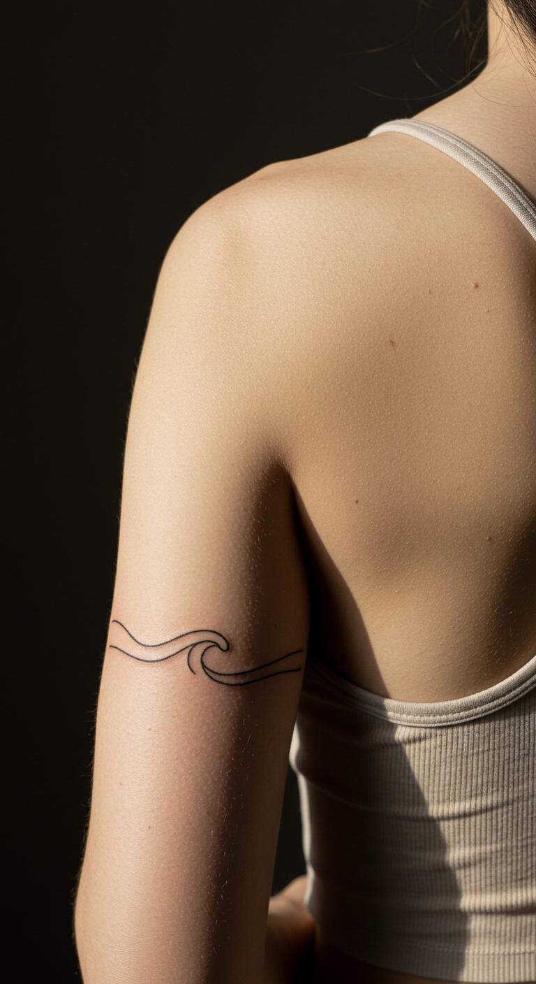A wave line design brings fluidity to your back arm. Draw wavy lines that mimic ocean ripples. Use a phone app to preview it on your photo. Artists in town often price this at around $60. For home trials, apply wash-off ink from drugstores to see how it moves with your arm. Keep waves subtle to fit active days. Combine with a tiny star for variety. Clean the area daily to preserve clarity. It adds a flow to your steps.