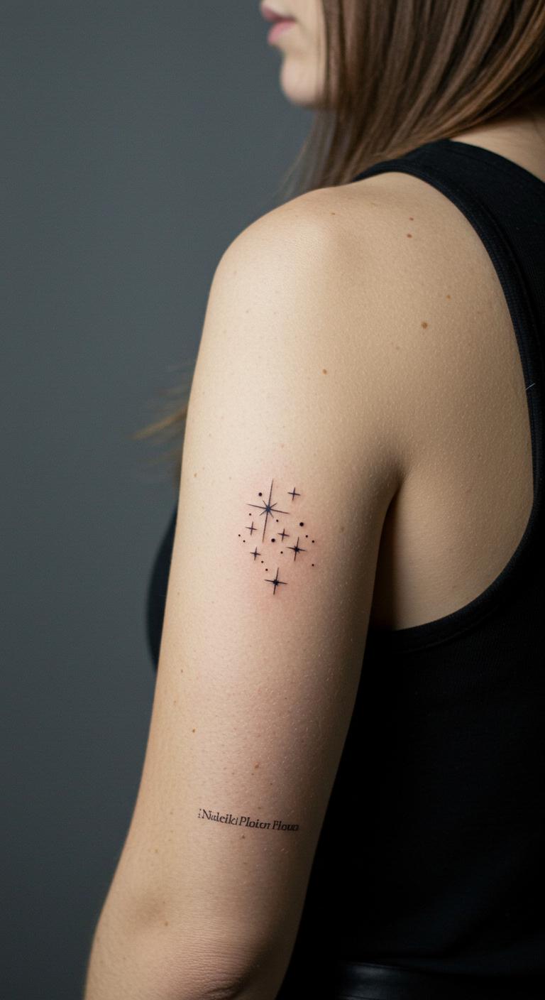 A star cluster arrangement sparks inspiration on your back arm. Start with three small stars in a row. Draw them on paper to plan spacing. Local pros might offer this for $50. Print temporary stickers from online templates for DIY practice. Place them high for discreet wear. Link stars with faint lines for a story. Use oil-free cream to protect them. It lights up your confidence.