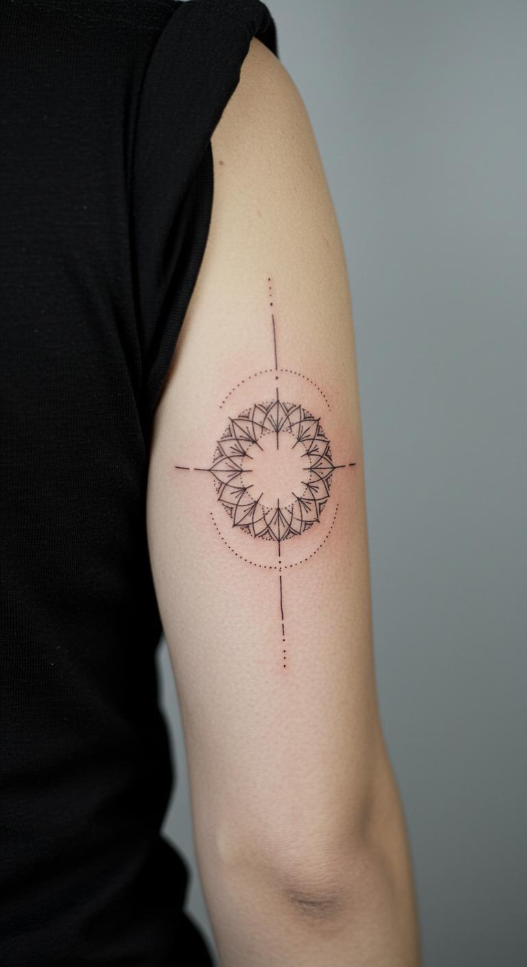 A circular mandala element adds symmetry to your back arm. Begin with a basic ring design. Trace it on tracing paper first. Studios often price this at $65. Use printable mandala sheets for DIY attempts. Center it for balanced appeal. Add inner details step by step. Protect with daily care routines. This design centers your focus.