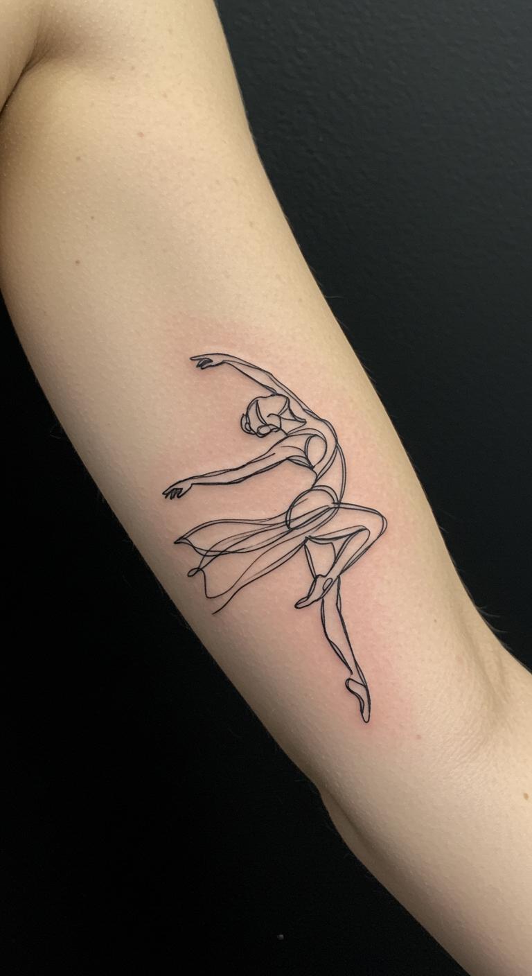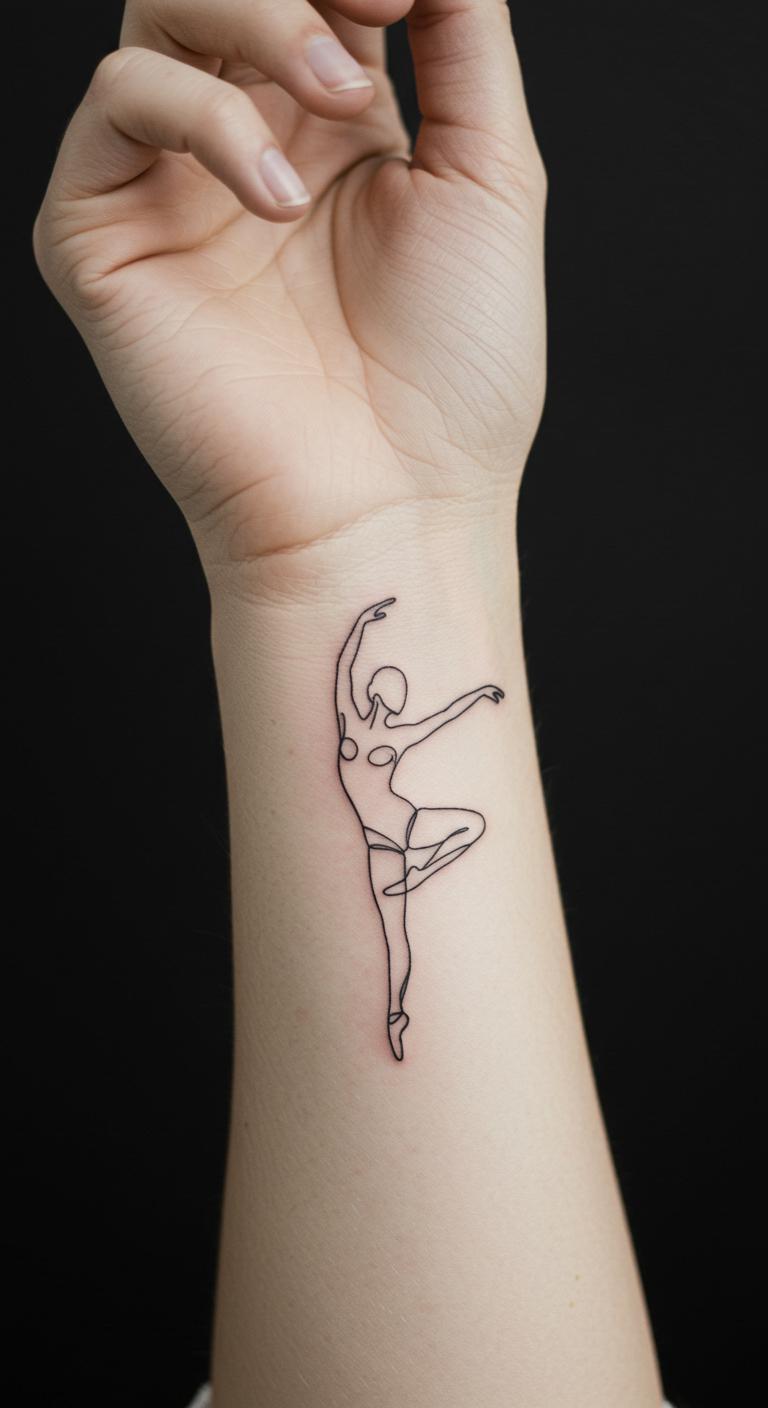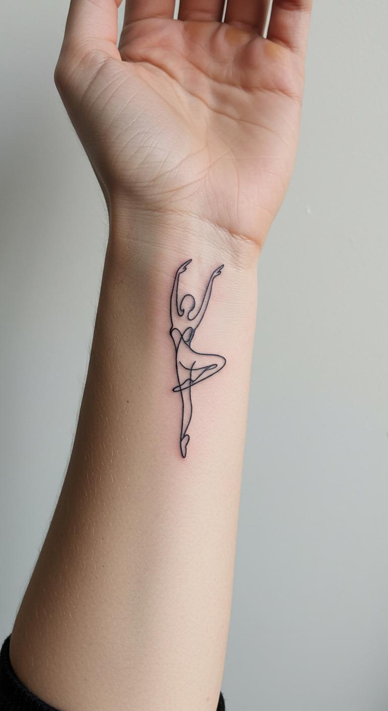 Think about a simple dancer outline that captures motion in just a few lines. This design uses fine black ink to show a ballerina mid-pose. Start small on your wrist for easy hiding or showing. Pick a local artist who specializes in fine lines—they often charge less than $100 for tiny pieces. For a DIY twist, sketch the silhouette on paper first and trace it onto your skin with temporary ink from a craft store. Keep lines clean and straight. Bold the key: fine lines make it last. Add a personal touch by choosing a pose that reminds you of a favorite dance. This tattoo fits daily life and fades less if placed carefully. Go for sessions under an hour to cut pain and cost. Pair it with neutral clothing to let it stand out subtly.