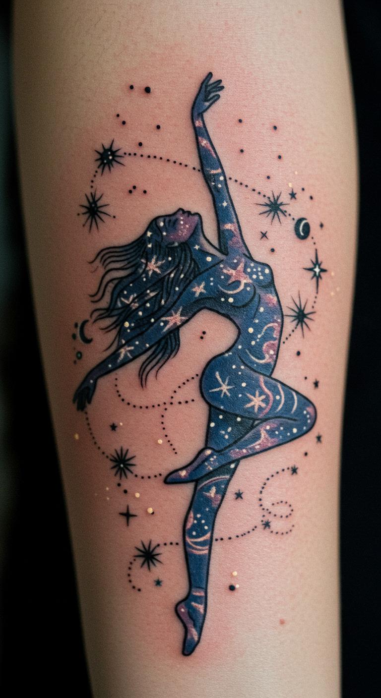 Combine stars with a dancer for a cosmic twist. Try the shoulder. Artists offer for $75. Sketch stars at home. Free tools online. Celestial mix adds wonder. Short visits work. Show under lights. Make it your constellation.