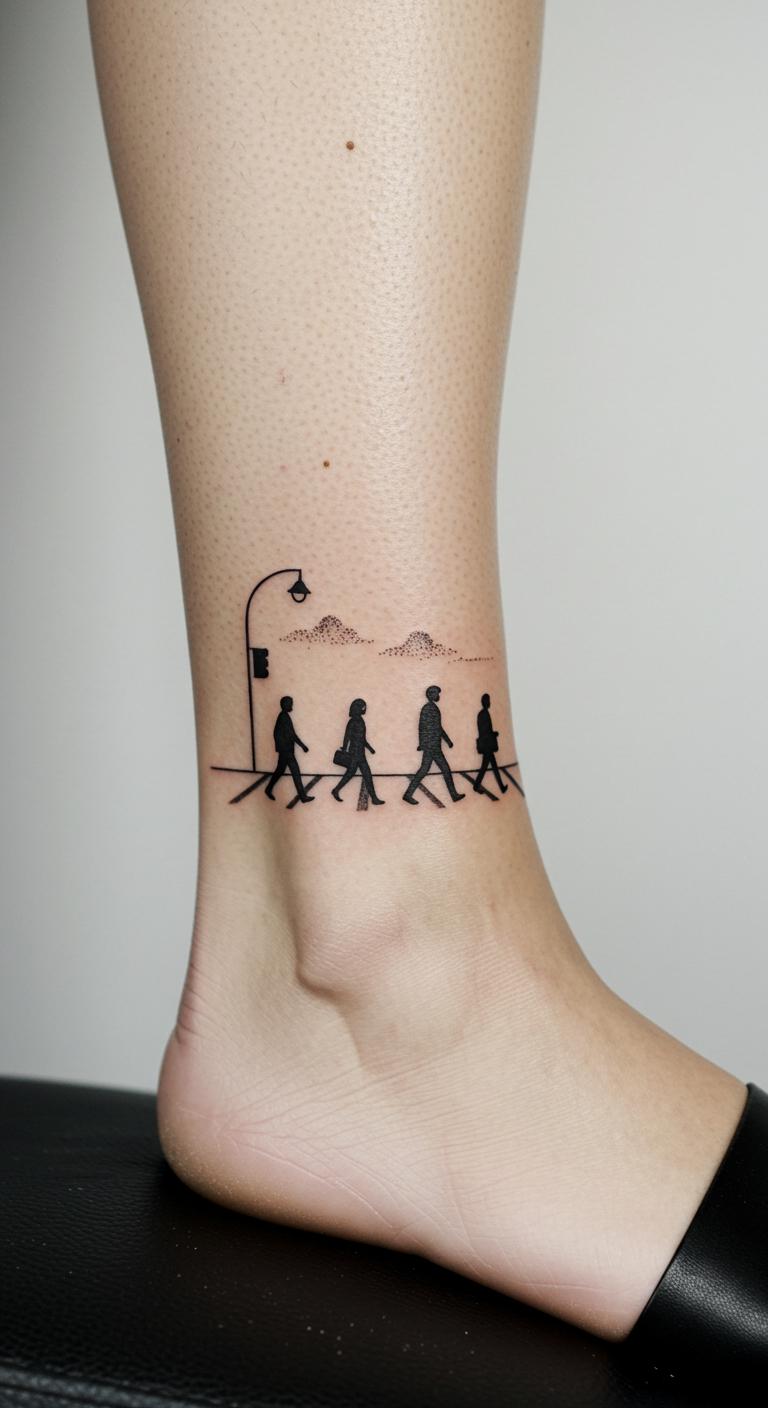 Capture the famous walk with this silhouette idea. Four figures stride across your skin, evoking that legendary cover. Begin by printing a basic outline online and tracing it yourself. Place it on your arm for a bold statement. Save money by opting for black ink only, which often costs under $150. Simple steps: Cut out a paper template and tape it on to test the look. This tattoo works well in small sizes to fit anywhere. A real DIY twist: Use a marker to draw it temporarily and wear it for a week to confirm. Focus on straight lines for that iconic feel. Pick an affordable studio with good reviews for line art. In the end, this design turns a classic moment into your personal story.