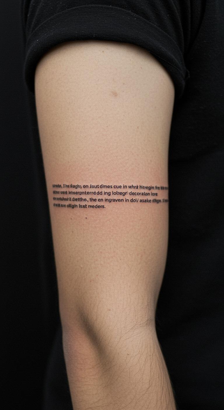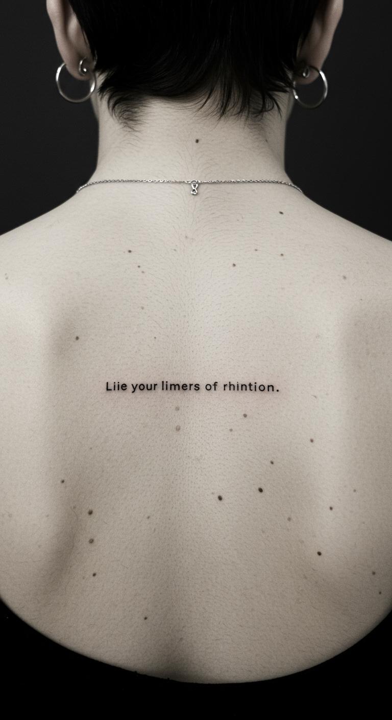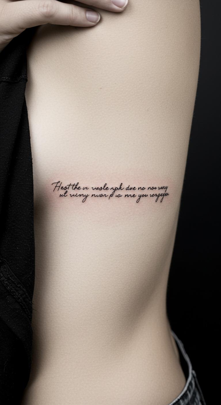 Inspire with quote lines. Use simple script for the words. Write it out on paper first. Position on your rib for a hidden gem. Save with basic lettering, about $110. Tip: Test fonts on your phone. DIY idea: Write it with a marker to feel it. Keep letters even. Look for text specialists. This design motivates every day.