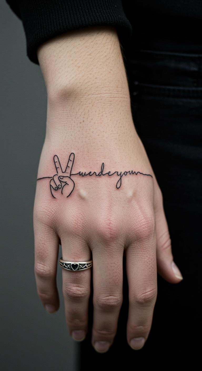 Combine symbols and words. Outline peace with lyrics. Write on a card first. Place on your hand for peace. Affordable: Combined elements $100. Tip: Merge designs on paper. DIY idea: Stamp it temporarily. Keep it unified. Choose a thematic artist. This design promotes harmony.