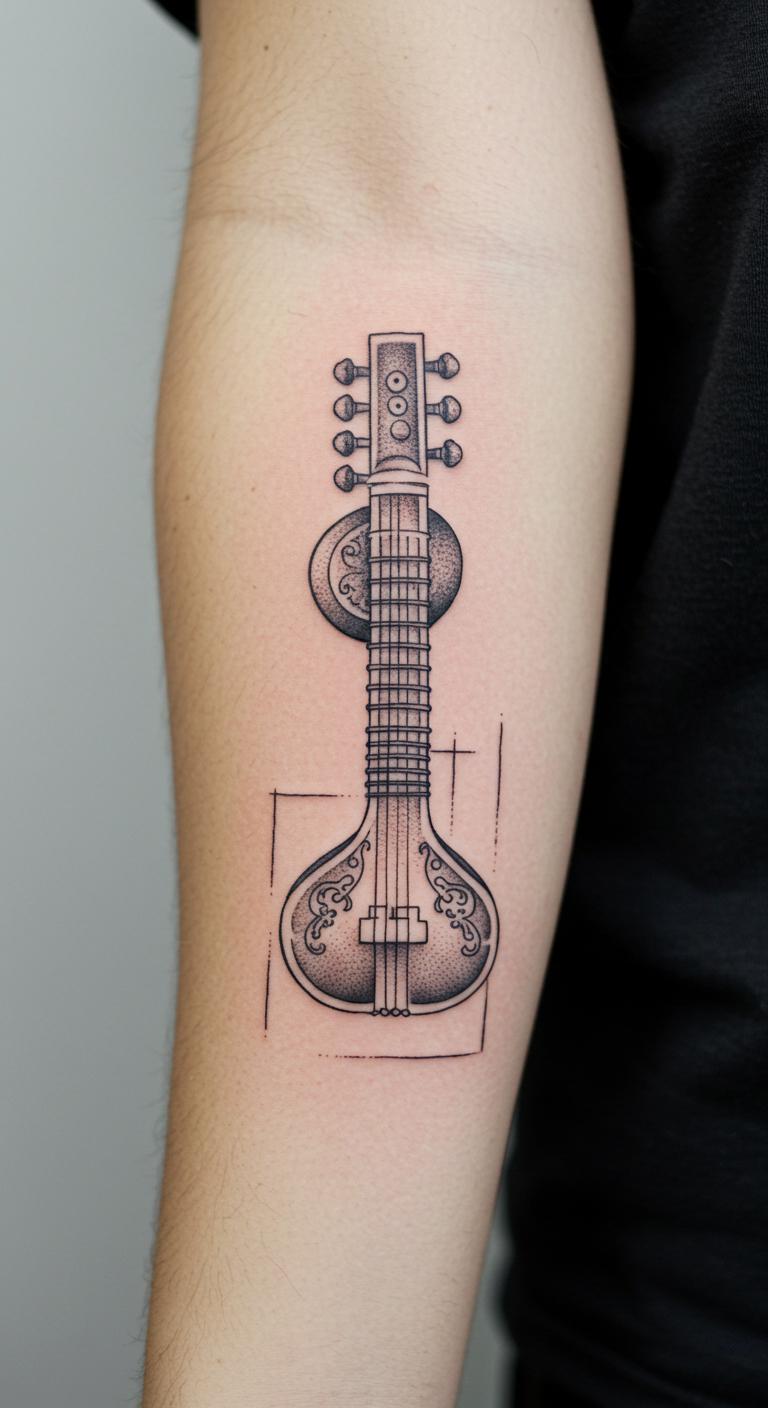 Pay tribute with a sitar outline. Keep it to essential lines of the instrument. Jot it down in your sketchbook first. Place it on your forearm for easy viewing. Save money with a linear design, under $130. Action: Draw the sitar from reference photos. Real DIY: Etch it lightly with a pen to test. Focus on accurate strings. Choose a tattooist who knows music motifs. This piece celebrates Harrison’s influence neatly.