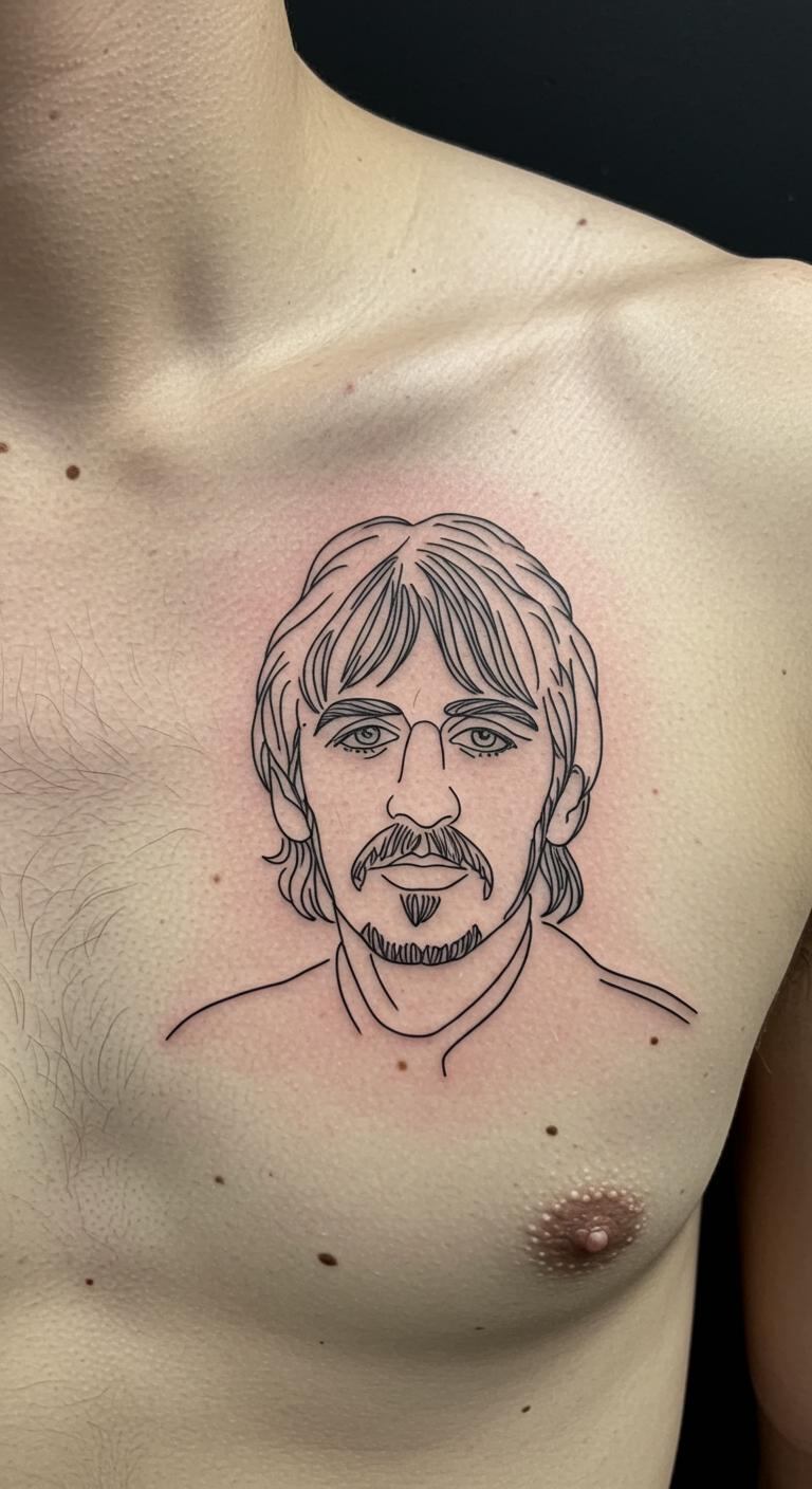 Go simple with Ringo’s face. Use just key features in outline. Practice by drawing his face on paper. Position it on your chest for a personal spot. Budget-friendly: Basic portraits might be $140. Tip: Use a mirror to sketch it on yourself. DIY idea: Apply a fake tattoo to check the fit. Stick to outlines for ease. Look for artists skilled in faces. This design honors the drummer effortlessly.