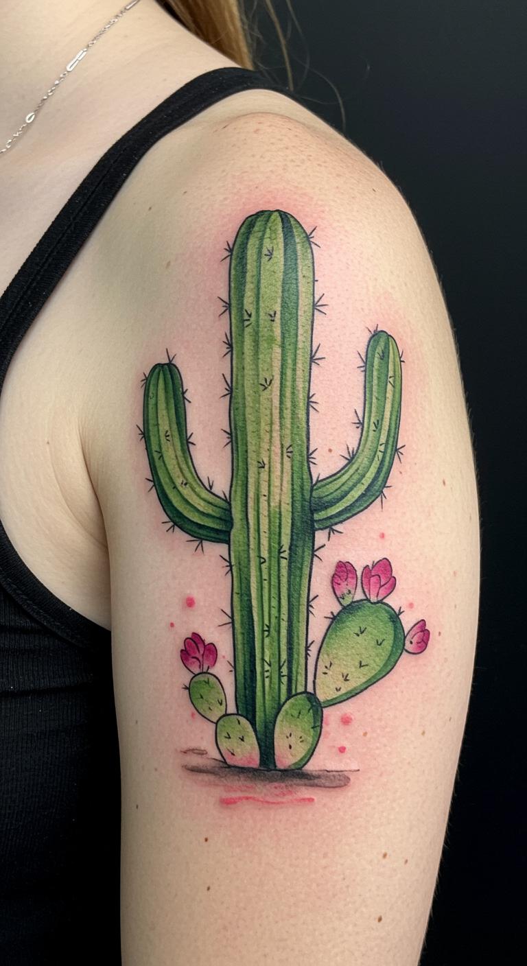 Watercolor adds soft colors to a cactus. Imagine greens fading into pinks for blooms. Place it on your arm for easy viewing. Use affordable inks to keep prices down. Draw inspiration from online photos and try your own version on paper. This style pops but stays simple. Aim for a design under 2 inches to cut costs. Artists might charge $150 for this look. Blend in a flower bud for extra charm. Practice with watercolors at home for ideas. Short sessions make the process fun. You end up with art that feels alive. Stick to two colors for simplicity. This tattoo suits casual outfits. Think about daily life: let it remind you of growth. No need for extras; it’s straightforward.