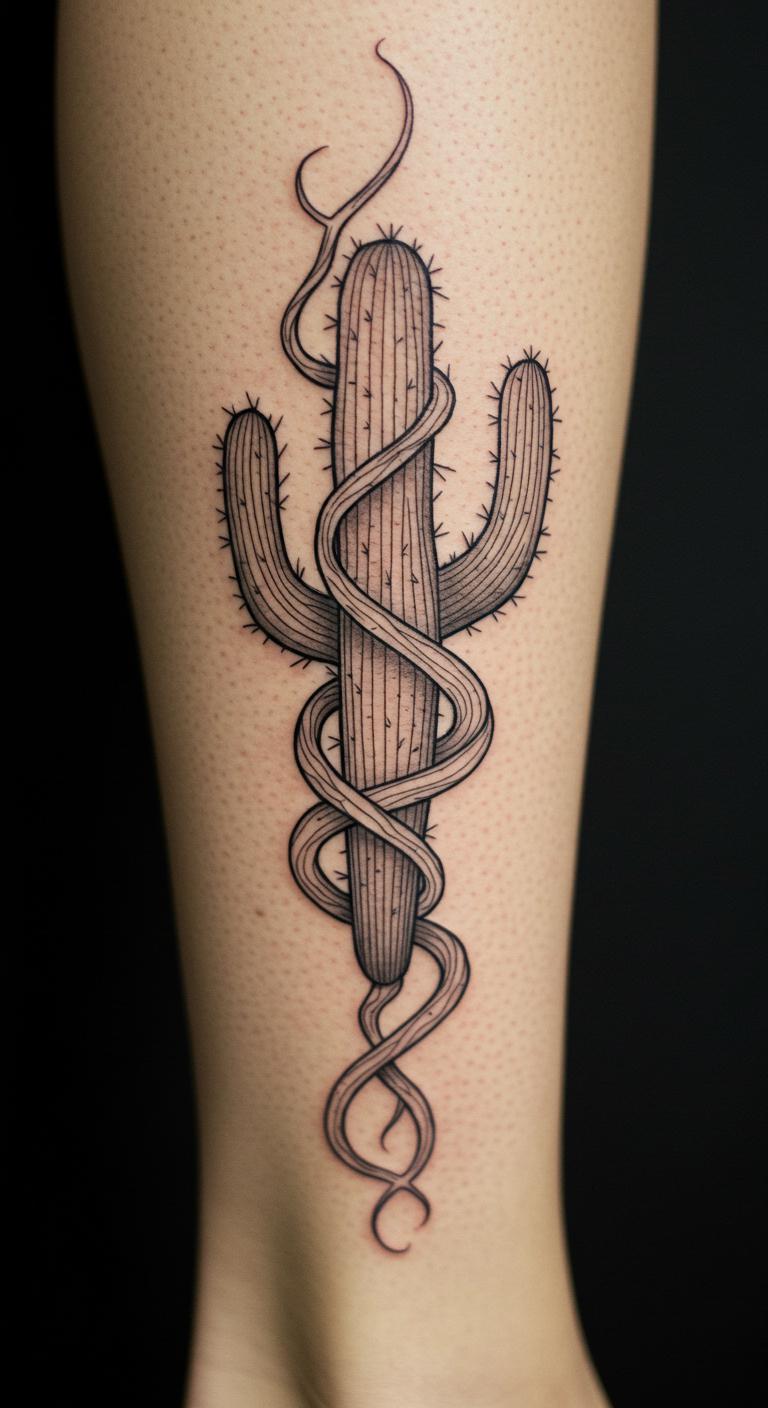 Wrap a vine around your cactus. Position it on your calf for flow. Stick to black for savings. Draw vines and cacti on paper. This adds movement. Aim for moderate size at $100. Let the vine twist gently. Experiment with string for ideas. Short sessions spark joy. You create a lively tattoo. Focus on the wrap. Pair it with socks. See it as growth in motion. Simple lines do the trick.