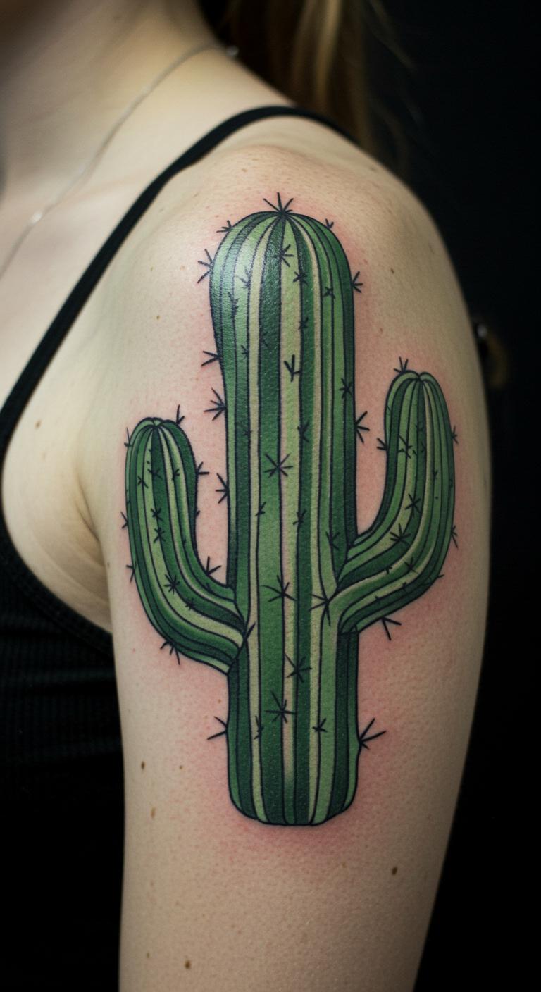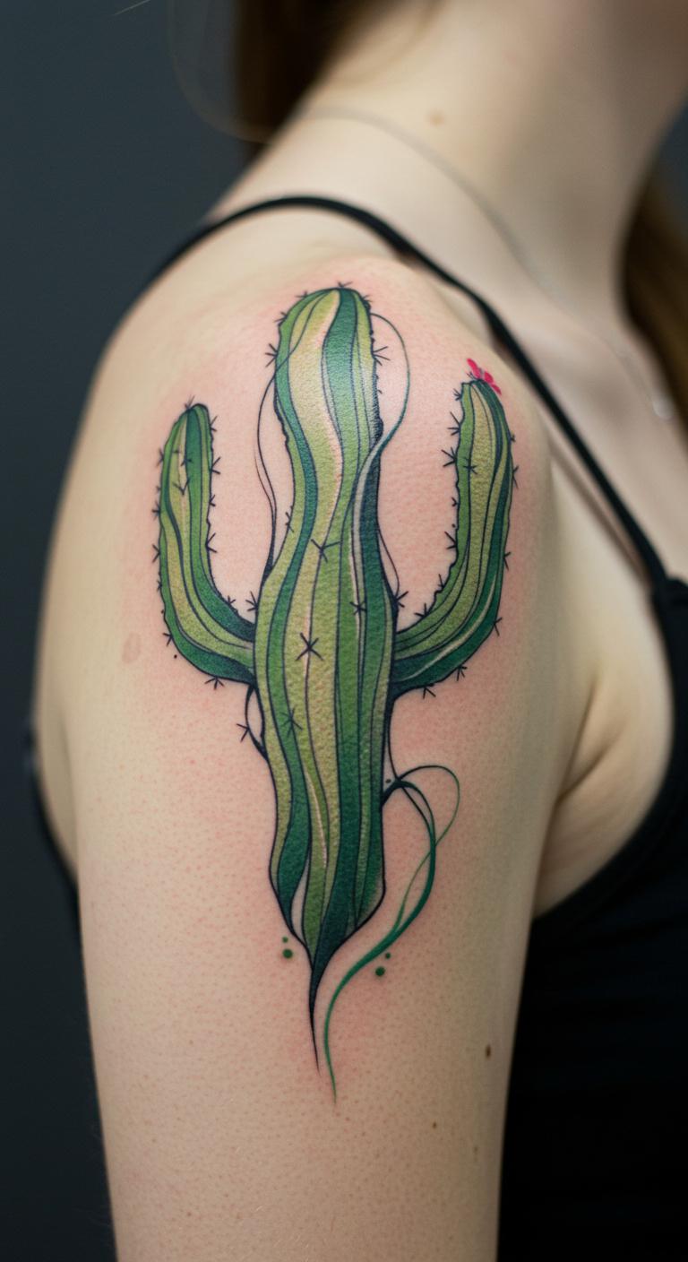Make the cactus abstract with waves. Place it on your shoulder for impact. Stick to simple ink for savings. Draw abstract shapes on cardstock. This style plays with forms. Go for a medium size at $110. Add curves for flair. Experiment with freehand at home. Quick drawings build excitement. You create unique art easily. Focus on flow. Wear it with tanks for show. Let it reflect your creativity. Easy changes fit perfectly.