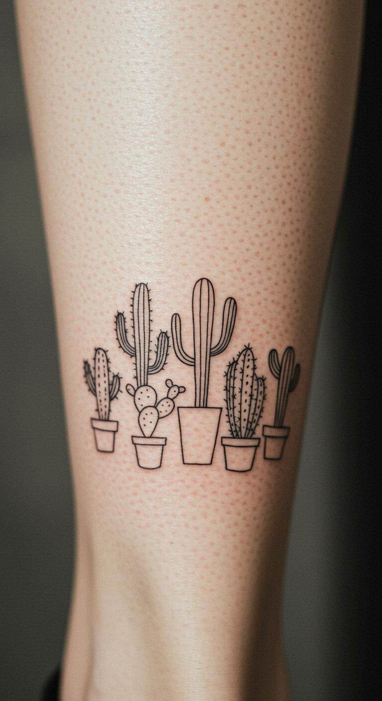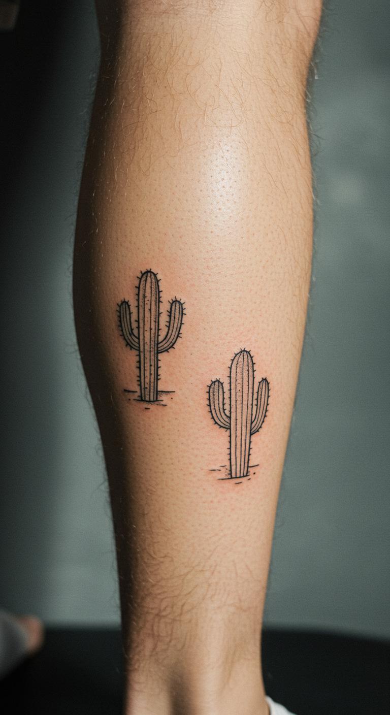 Pair two cacti for symmetry. Tuck them on your calf. Use matching lines for budget. Draw pairs on paper. This idea balances well. Go for equal sizes at $100. Mirror the shapes. Practice with twins in sketches. Quick draws assist. You get a harmonious tattoo. Highlight the pair. Cover with pants. Let it mean partnership. Simple mirroring helps.