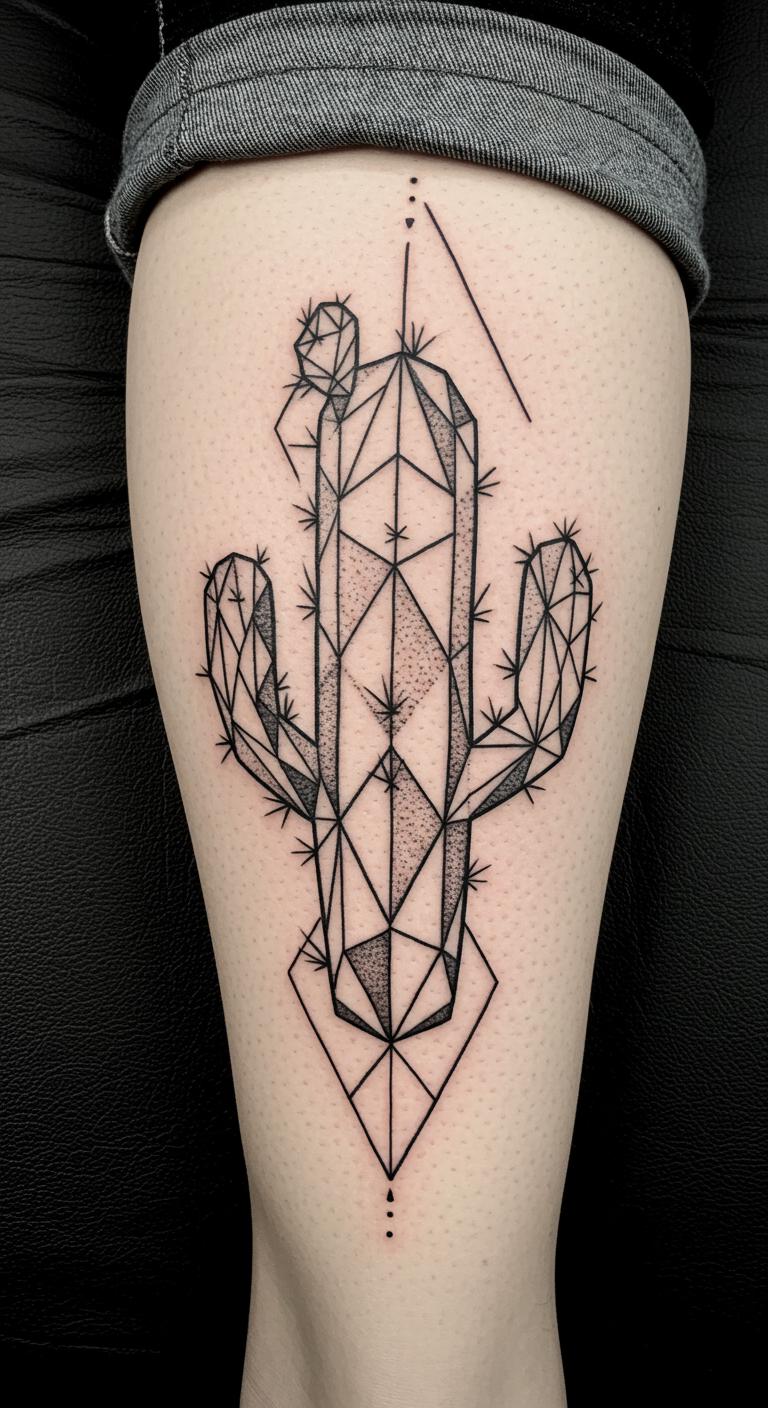 Mix shapes like triangles with a cactus form. Put it on your back for a bold statement. Choose black outlines to stay cheap. Grab graph paper and sketch patterns yourself. This combo looks modern and fits any size. Opt for small versions to save cash, maybe $80 total. Add a simple circle for balance. Experiment with rulers at home for designs. Quick drawings help you decide fast. You get a piece that merges nature and art. Keep lines straight for impact. Wear it with tees for everyday style. Let it represent your steady path. Easy tweaks make it yours.