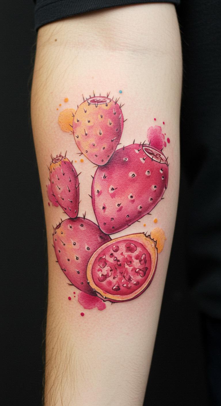 Watercolor a prickly pear softly. Put it on your arm. Pick blended hues for fun. Draw watercolor pears. This softens the look. Go for colored at $110. Mix shades. Try watercolors yourself. Quick practices inspire. You create a fluid tattoo. Emphasize the blend. Show with confidence. Let it evoke nature. Simple colors work.