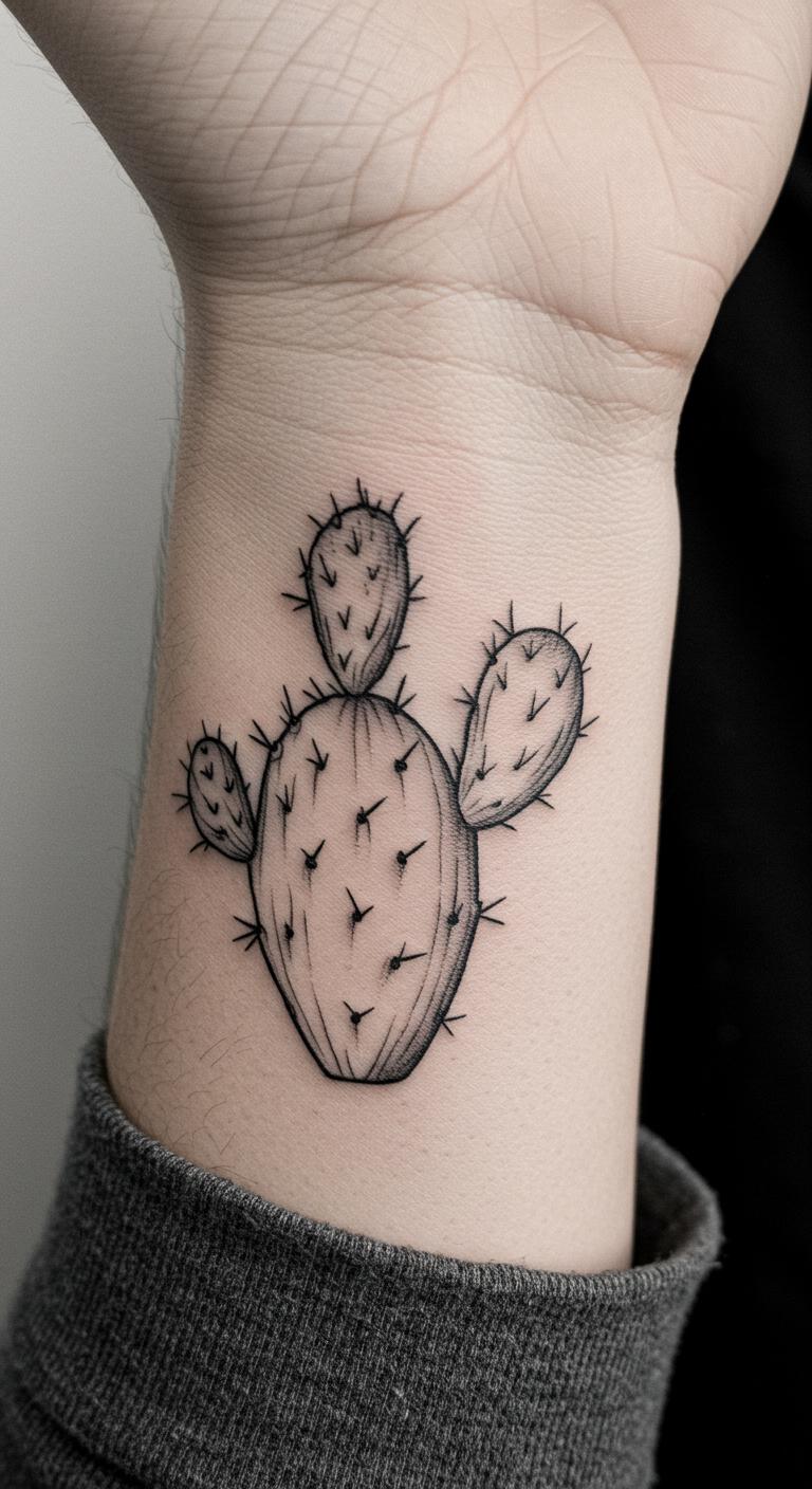 Fine lines make a prickly pear stand out. Place it on your wrist for quick glances. Stick to black ink for savings. Draw it on notebook paper before committing. This style is all about precision. Choose a 1-inch design to cut expenses, perhaps $60. Add subtle spines for texture. Try fine-tip pens at home for practice. Short bursts keep it enjoyable. You get enduring art with ease. Emphasize thin strokes. Wear it under sleeves for versatility. Let it symbolize your grit. Minor changes make it personal.