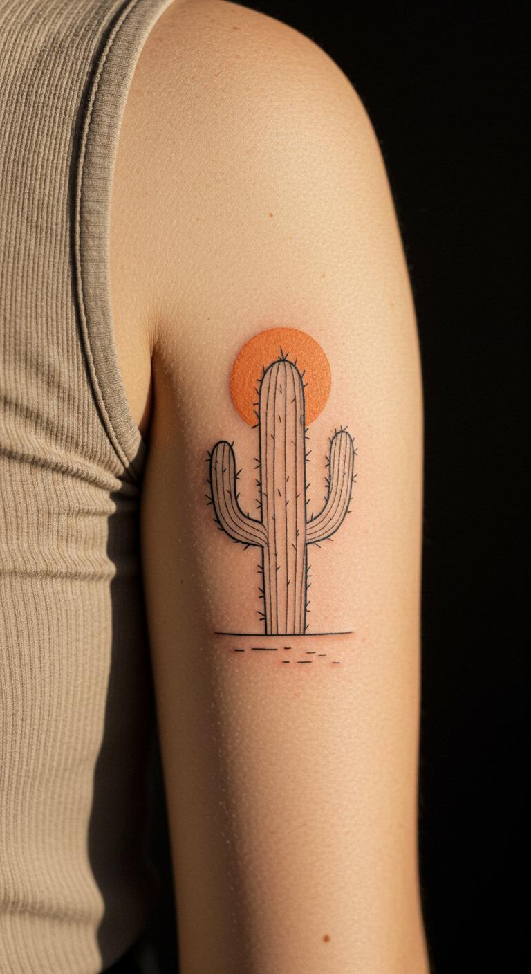 Think of a basic saguaro shape as your starting point. It uses one color and few lines. This design fits small spots like your wrist. Go for black ink to keep costs low. Sketch it at home with a pen on paper first. That way, you see how it looks before hitting the shop. Pick a spot that hides easily for work. Artists charge less for simple tattoos, often under $100. Add a tiny flower if you want more flair, but stick to basics. This idea works for anyone new to ink. Try drawing it on your skin with washable marker to test. Focus on clean lines for that sharp vibe. You get a symbol of endurance without much fuss. Keep it small to save money and pain. Real talk: pair it with daily routines, like seeing it during workouts. That makes it meaningful fast.