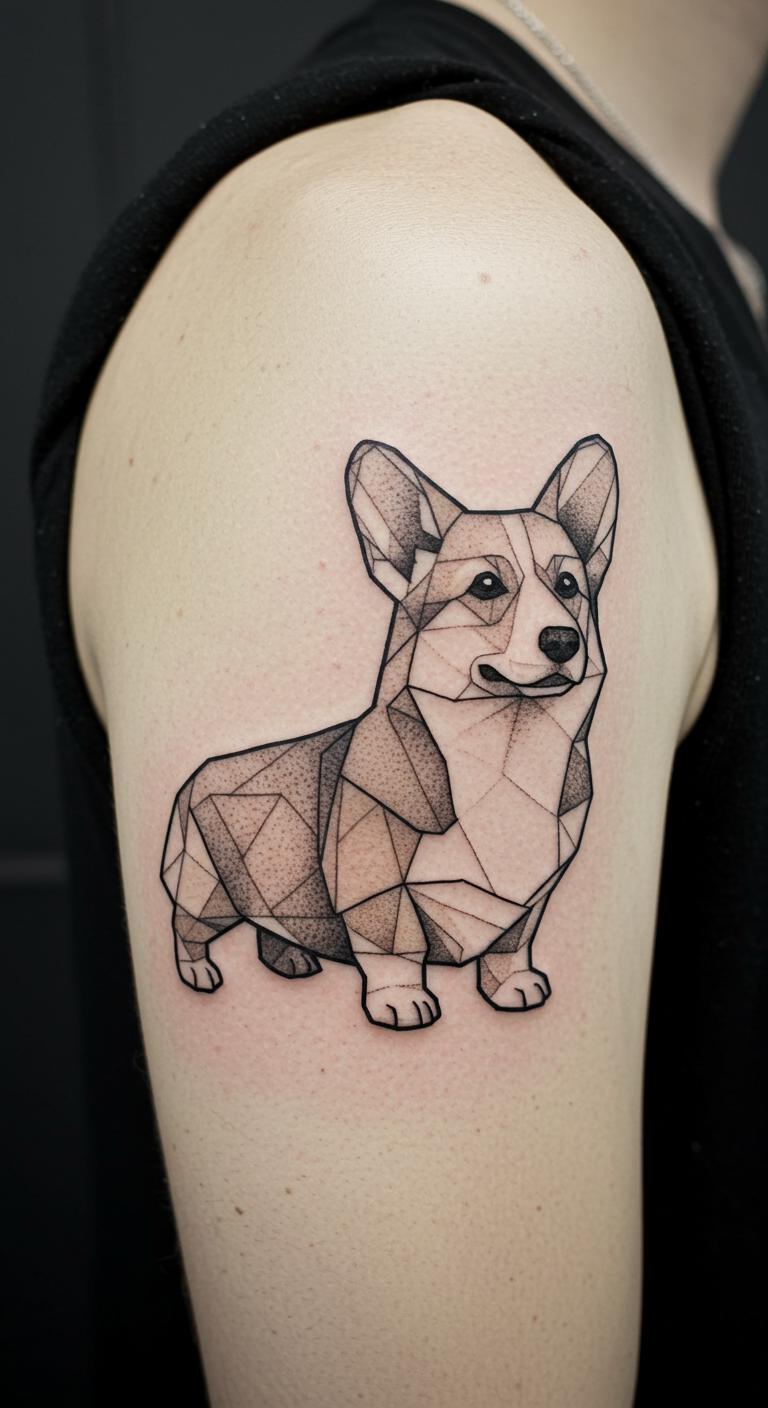Geometric corgi tattoos turn your pet into cool shapes and angles. Picture triangles for ears and squares for the body. Draw this at home using graph paper and a pencil. It’s a simple way to experiment before ink. Save money by finding free design apps on your phone. Aim for a small spot, like your arm, to cut costs. Start by sketching a few variations on paper. This lets you adjust the design to fit your taste. Once ready, chat with a tattoo artist about affordable rates for basic shapes. Add elements like a star for extra flair if you want. The key is keeping it straightforward. Use this as a DIY project to build confidence. You’ll end up with art that feels unique and modern without breaking the bank.