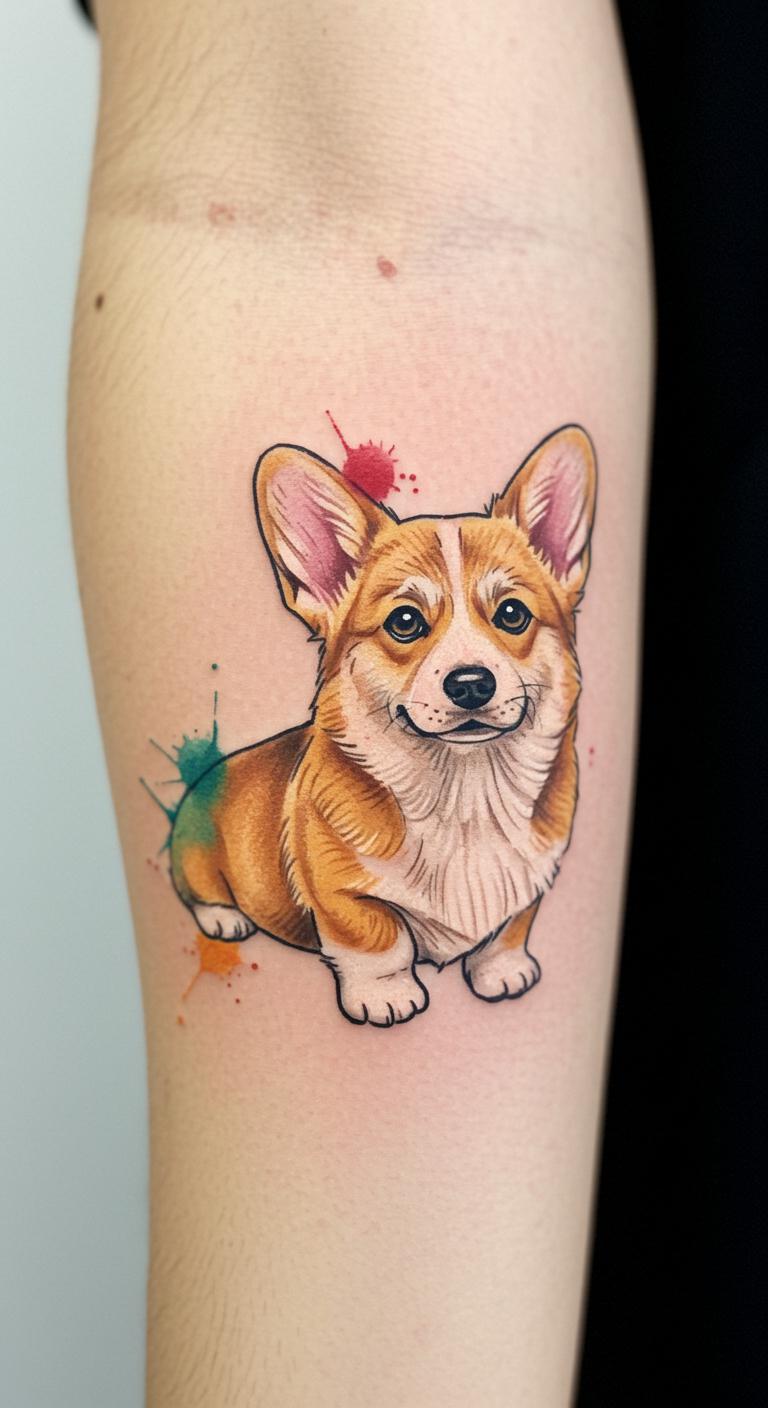 Blend watercolor effects for a soft corgi look. Use light colors around the edges. Experiment with watercolors on paper. It’s affordable and fun. Search for blend tutorials online. Place it on your arm for visibility. Layer colors step by step. This method lowers tattoo costs. Ask artists about watercolor techniques. Add your color choice. Practice with kid’s paints. The result is dreamy and easy.