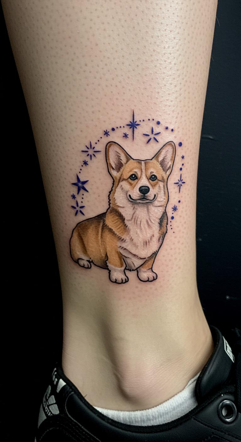 Surround your corgi with stars for a starry theme. Place small stars near the body. Doodle this on paper first. It’s straightforward. Use star apps for free. Opt for your ankle. Add stars one by one. This reduces complexity. Find combo deals at shops. Customize star sizes. Try with stickers. The design sparkles on a budget.