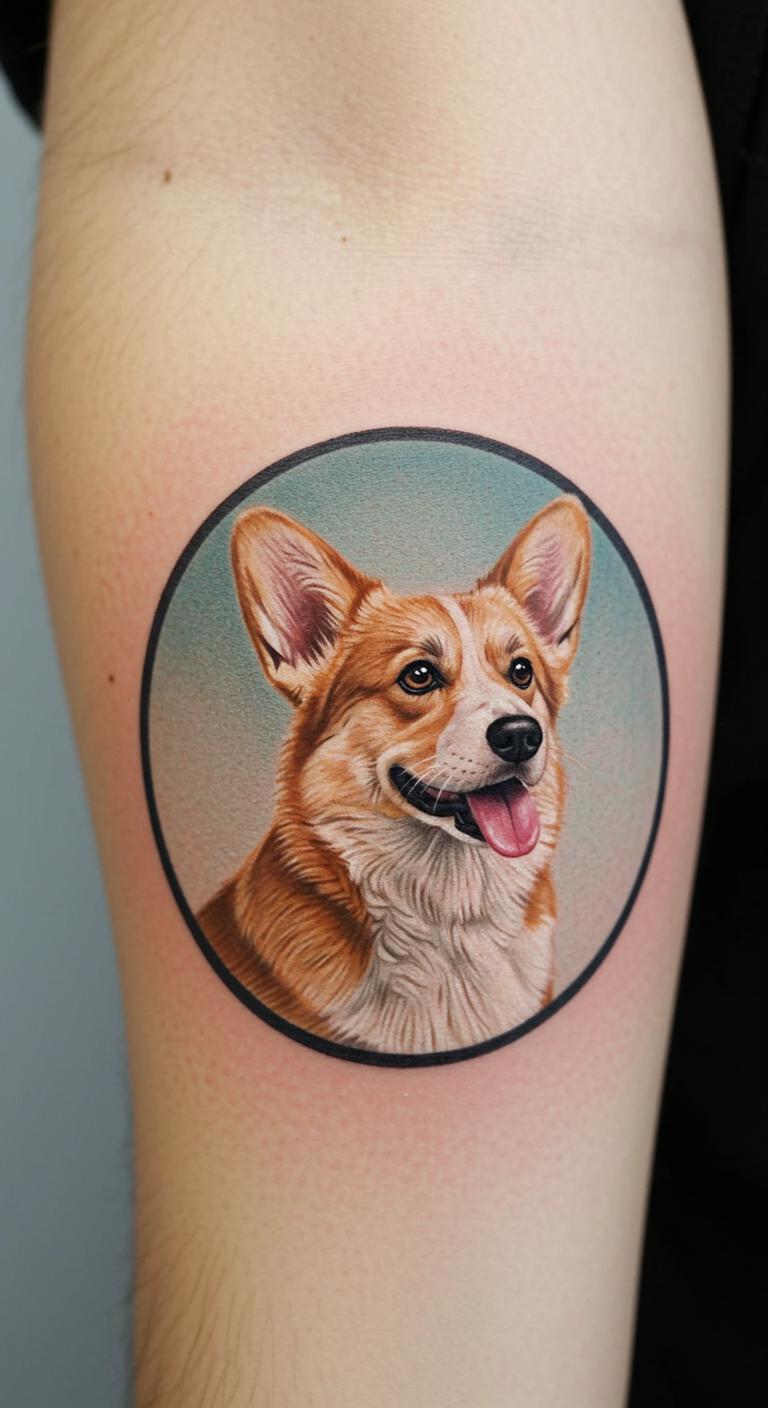 Frame your corgi in a circle for a neat look. The circle adds structure. Sketch the setup on paper. Keep it simple. Use circle templates online. Place it on your arm. Draw the circle first. This streamlines the tattoo. Find framing deals. Customize the circle edge. Try with drawings. It’s contained and budget-friendly.