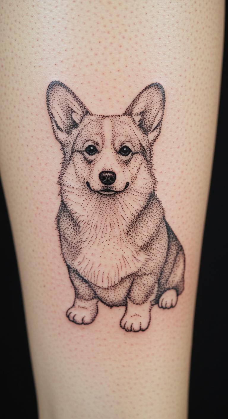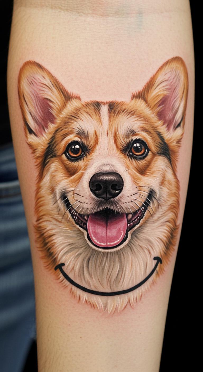 Go cartoon style for a fun corgi face with big eyes and a smile. This plays up the breed’s goofy charm. Try drawing it on paper first with markers. No need for fancy tools—just keep it lighthearted. Grab affordable cartoon stencils from craft stores. Place it on your forearm for daily visibility. Build the design step by step, starting with the face. This keeps costs low at the tattoo shop. Add a bow or hat if you like. It’s a quick way to express joy. Practice with washable pens on your skin. You’ll love how it turns out.