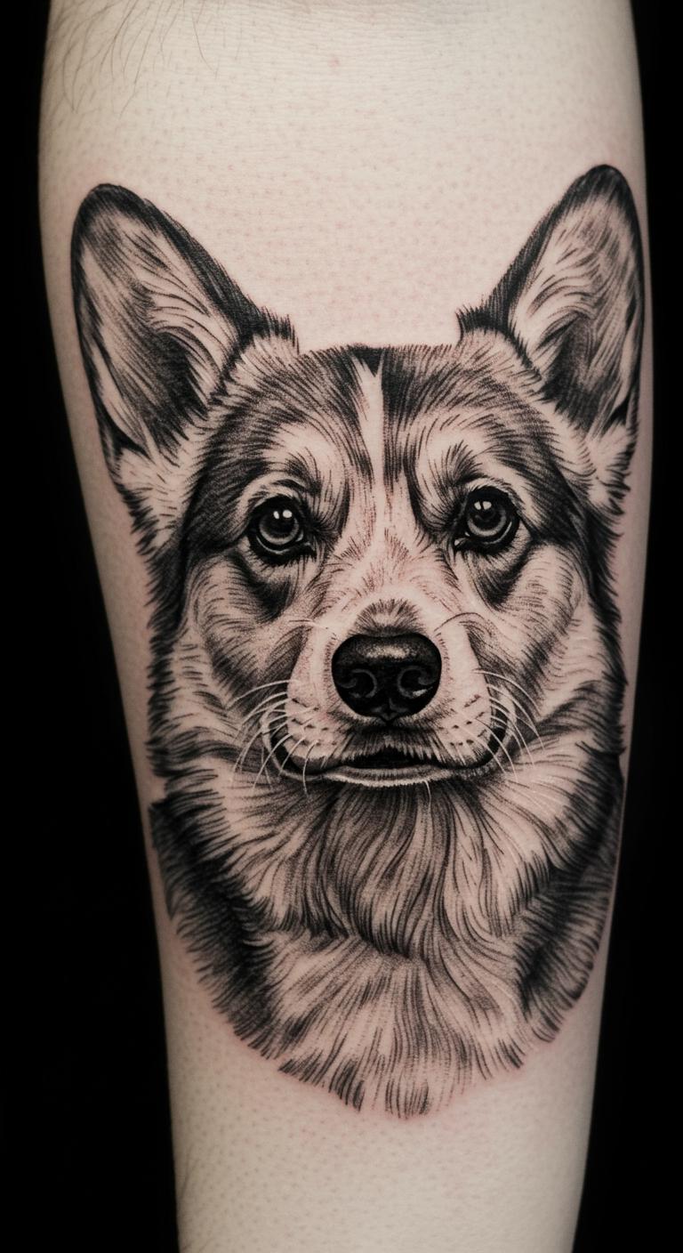 A monochrome corgi portrait keeps things bold yet simple with black ink only. Focus on the eyes and ears for that cute vibe. Sketch it yourself on plain paper to get a feel. This step costs nothing and helps refine the look. Look for cheap temporary versions online to try first. Place it on your back for easy hiding if needed. Begin with a basic outline, then add light shading. Talk to artists about lower rates for smaller pieces. Make it personal by basing it on your own dog’s photo. This makes the tattoo more meaningful. Keep the process light—grab a friend to brainstorm ideas. In short, it’s an affordable way to celebrate your corgi.