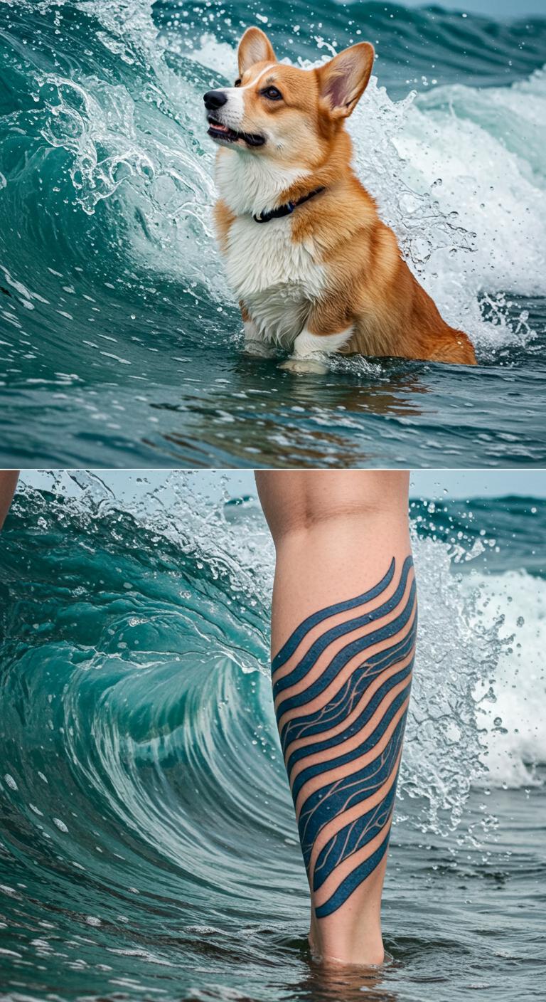 Add wave lines around your corgi for flow. Waves suggest fun or water. Doodle waves and dog on paper. Simple start. Use wave apps for free. Place it on your leg. Add waves last. This saves money. Discuss line work with artists. Make waves your style. Test with drawings. It’s fluid and affordable.