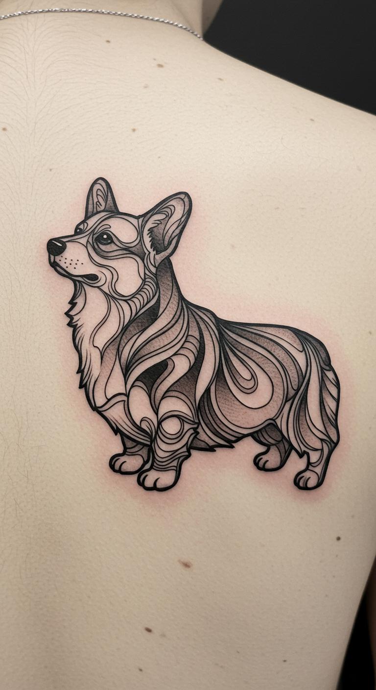Abstract patterns turn your corgi into swirling lines and shapes. Think waves for fur or dots for spots. Experiment on paper with pens. Free tools online make this simple. Put it on your shoulder for balance. Start with one pattern element. This cuts down on complexity and cost. Discuss options with an artist for affordable tweaks. Add your twist, like swirls for personality. It’s a creative, low-key choice. Try it as a DIY sketch first.
