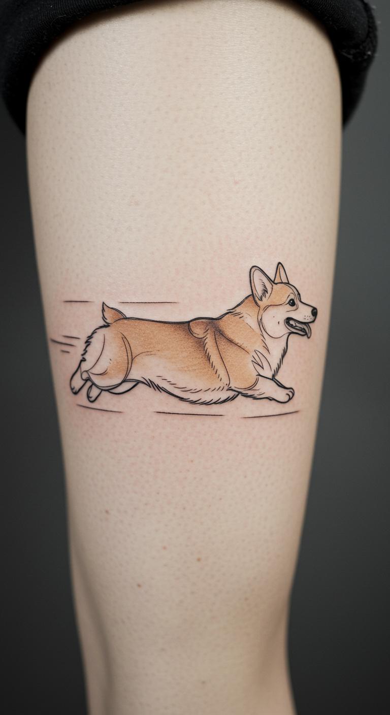 Show your corgi running with fluid lines. This adds energy to the design. Draw the pose on paper first. Practice makes it perfect. Use free motion apps for ideas. Opt for your leg to show movement. Start with the legs, then the body. This approach saves on ink. Find deals for dynamic designs. Personalize the speed lines. Try temporary versions. The tattoo will feel alive.