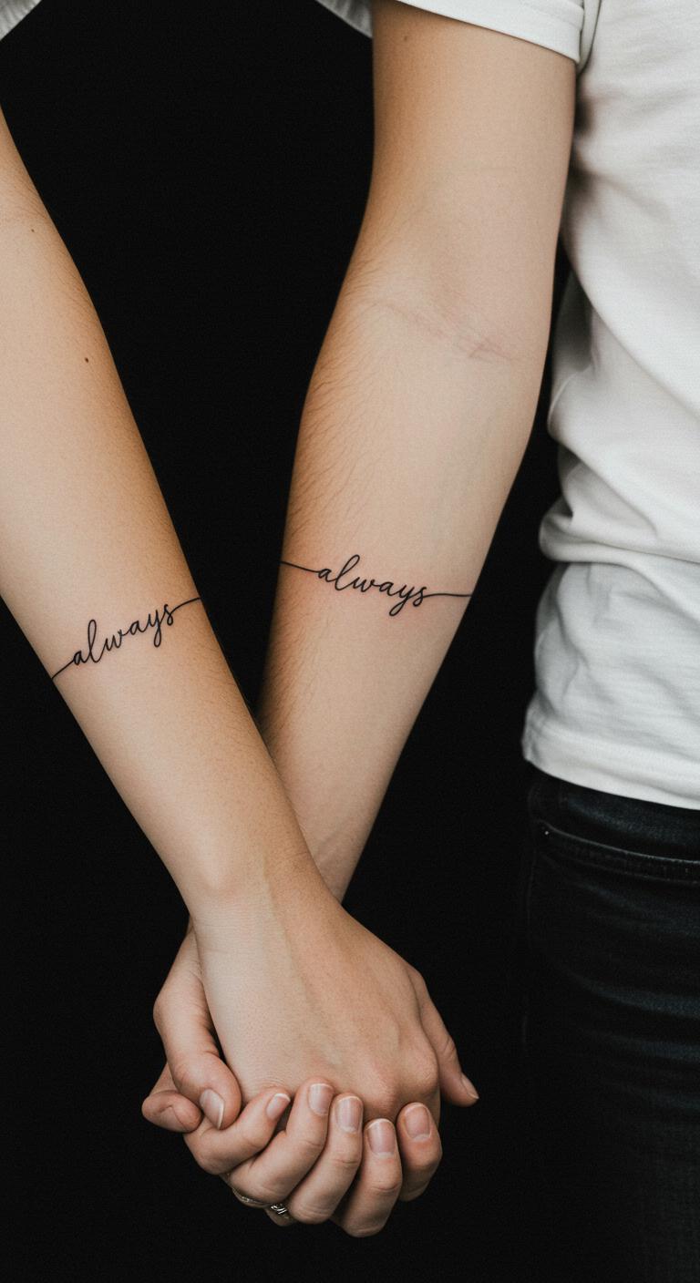 Short phrases like “always” speak volumes. Decide on a word that fits. Scribble it on paper as a DIY start. This helps refine ideas cheaply. A script tattoo could be $60. Place it on your arm for inspiration. These tattoos reinforce your vows. Break it between you for fun. Tip: Practice handwriting styles. This makes it truly yours.