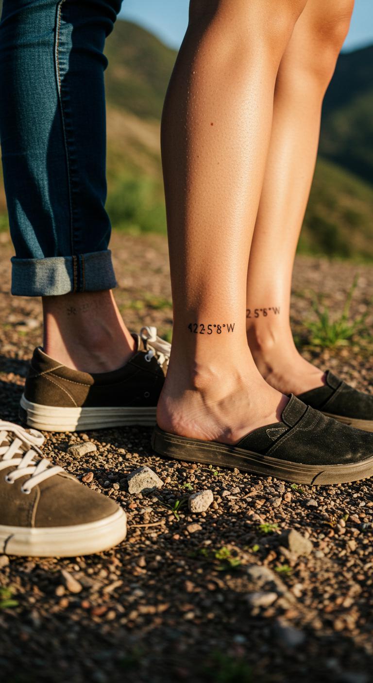 Mark the spot where you met with coordinates. Use a free map app to note the exact spot. Jot it down on paper as a DIY plan. This avoids rush decisions and cuts costs. A simple tattoo like this might cost $60. Opt for your ankle to keep it discreet. These tattoos tell your personal tale. Add a small symbol next to the numbers for extra flair. Simple action: Verify the coordinates together. This ensures the design feels right before inking.