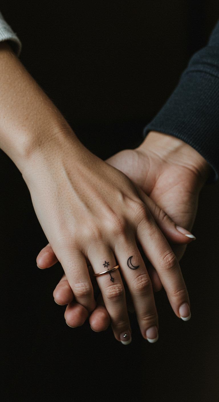 Finger spots are perfect for unity. Try a word like “love” split between you. Sketch it out at home with markers. This DIY method lets you experiment cheaply. Find an artist who charges by the hour, around $40. Place it on your ring finger for a wedding-like feel. These tattoos symbolize your promise. Combine it with a celestial motif for fun. Practical tip: Choose a spot that hides easily at work. This keeps the tattoo versatile for daily life.