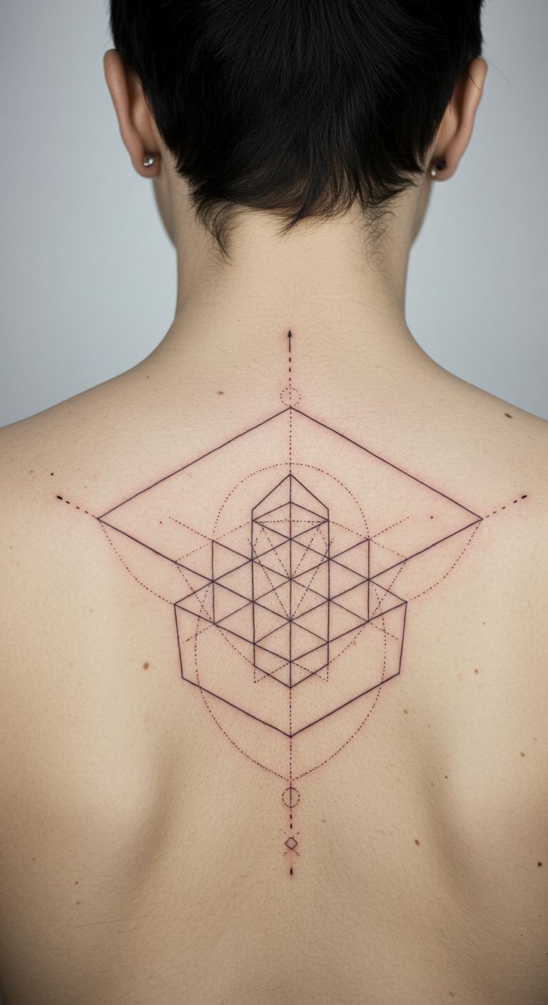 Geometry on your back offers symmetry. Fine lines form patterns. Sketch symbols first. Build designs. DIY save: Geometry tools at home. Patterns mean order. Visit a pro artist. Check work. Make it fitting. Cover with clothes. Back tattoos heal well. Add more elements. Consider your center. People pick for focus. Basic care suffices.