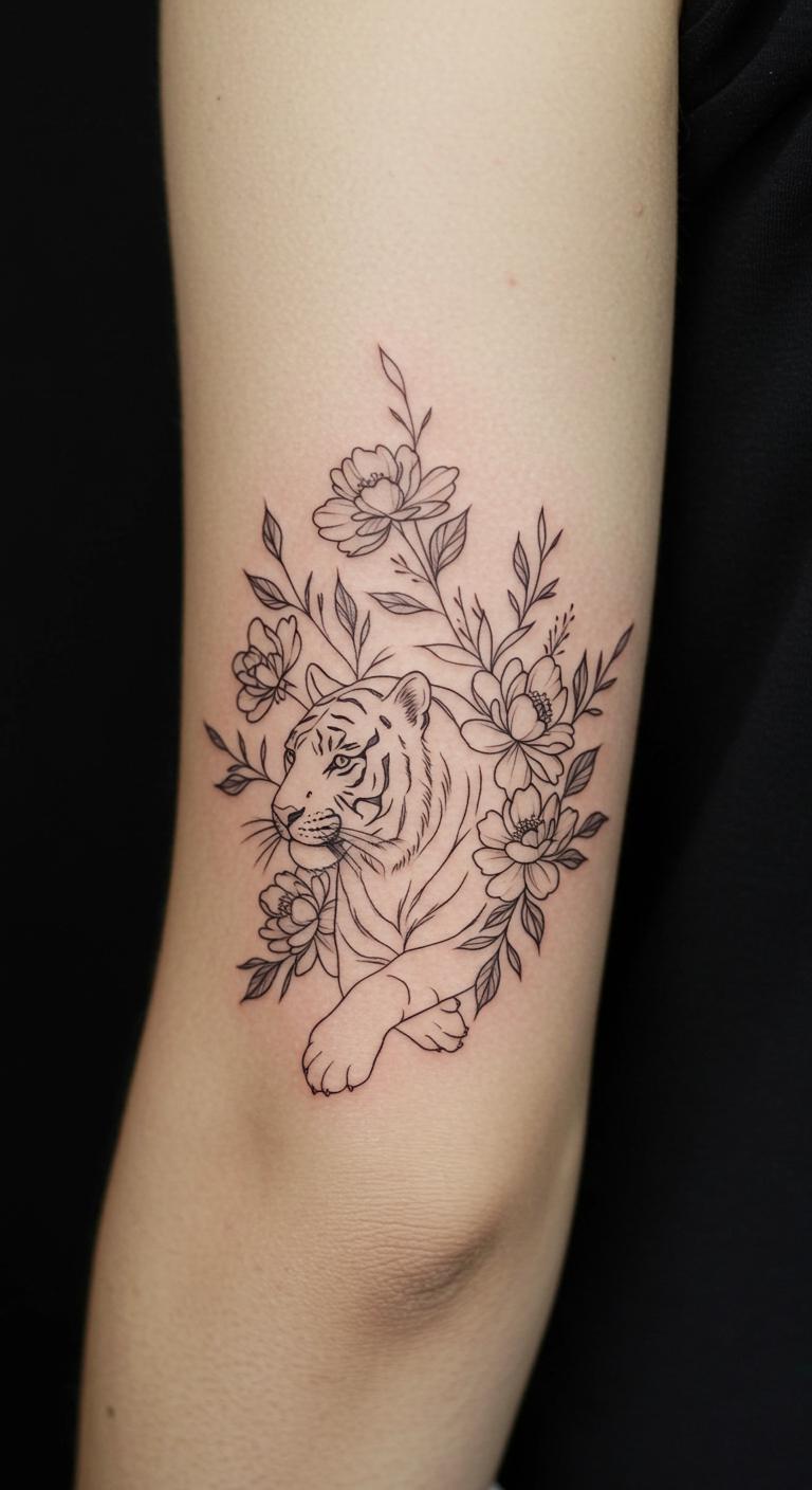 Tiger and flowers on your arm show strength. Thin lines detail it. Draw tigers simply. Add blooms. Thrifty find: Animal sketches online. This means power. Pick a detailed artist. Review pieces. Keep balanced. Protect as usual. Arms are practical. Build on the theme. Reflect on traits. People choose for stories. Care maintains lines.