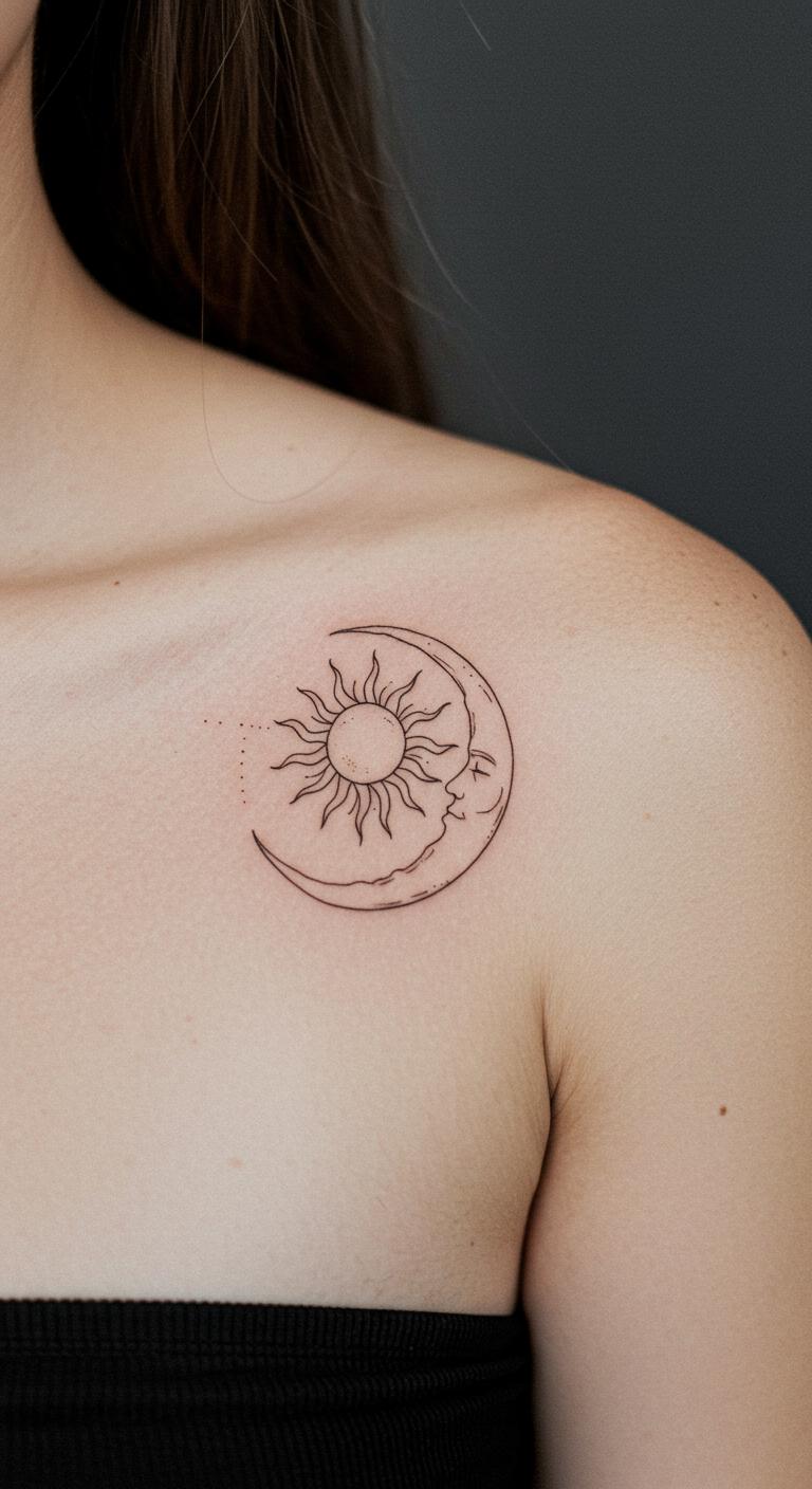 A sun and moon together show balance. Fine lines connect them neatly. Draw suns and moons simply. Mix shapes on paper. Free tip: Trace from nature apps. These symbols mean new starts. Go to a skilled local tattooer. Check reviews quick. Size it for your spot. Hide under shirts easily. Use sunblock for protection. Build a celestial set. Reflect on your cycles. Many choose this for depth. Standard aftercare works fine.