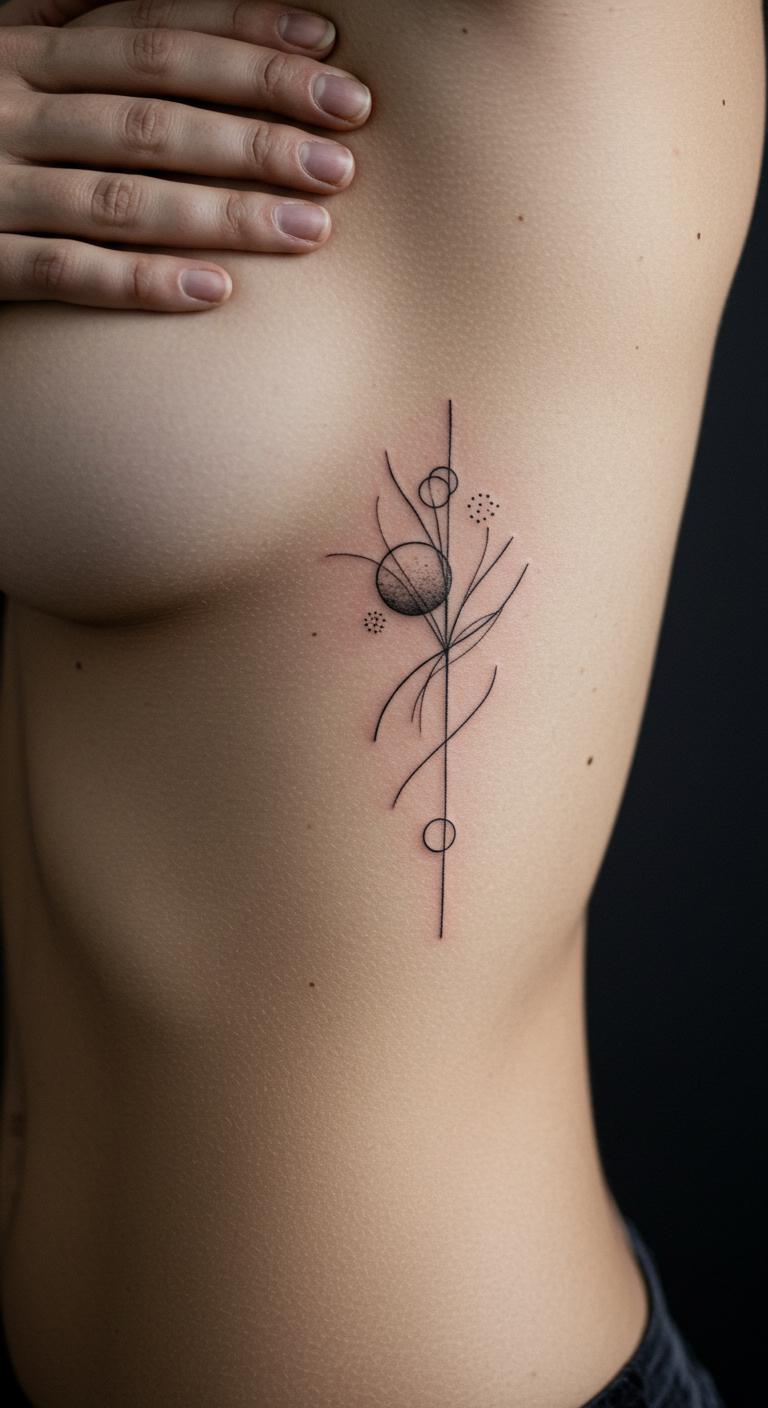 Abstract shapes on ribs offer mystery. Thin lines keep it abstract. Doodle freeform on paper. Play with curves. Save money: Use drawing pads you have. Shapes stand for harmony. Pick an artist with style. View their portfolio. Make it discreet size. Cover with clothes daily. Ribs heal with care. Add more for a series. Ponder your emotions. Folks like this for art. Basic routines maintain it.