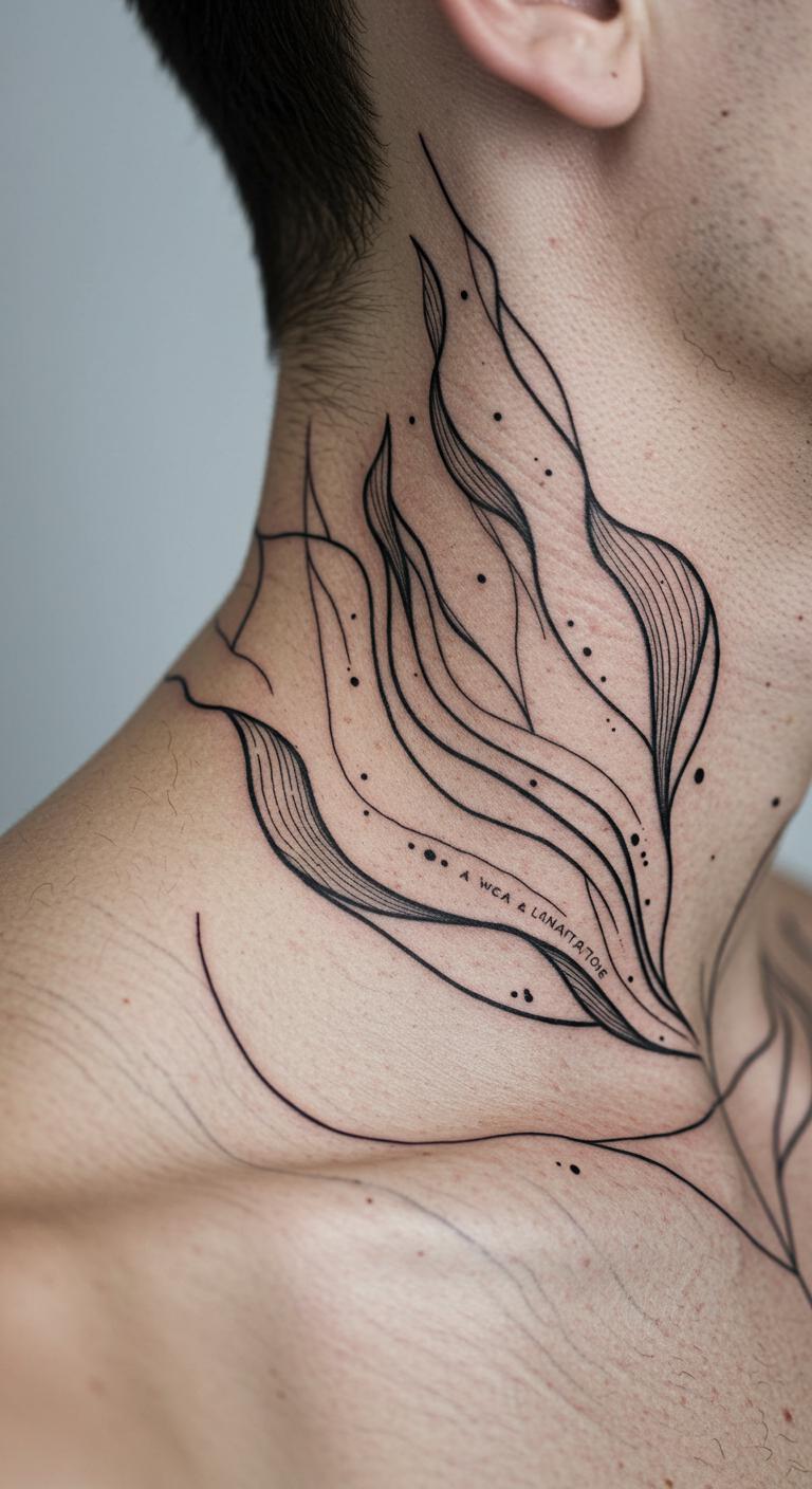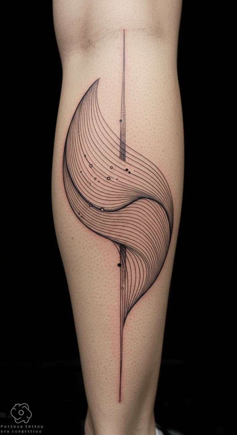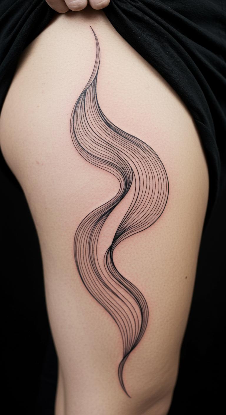 Abstract free-form lines create flowing designs in fine ink. Try on thigh. Sketch curves on paper. Pick expressive spots. Personalize freely. Find options. Maintain easily. Experiment home. Creative flow.