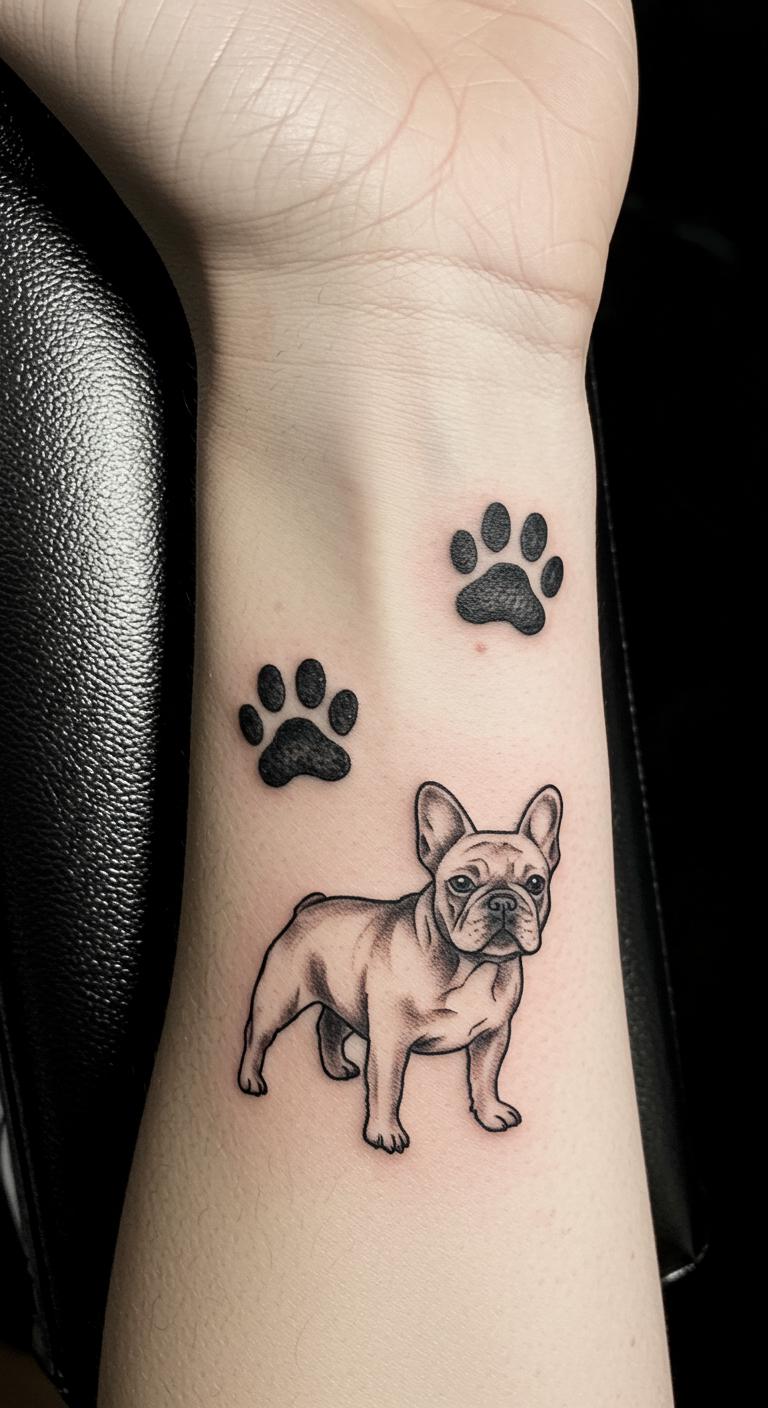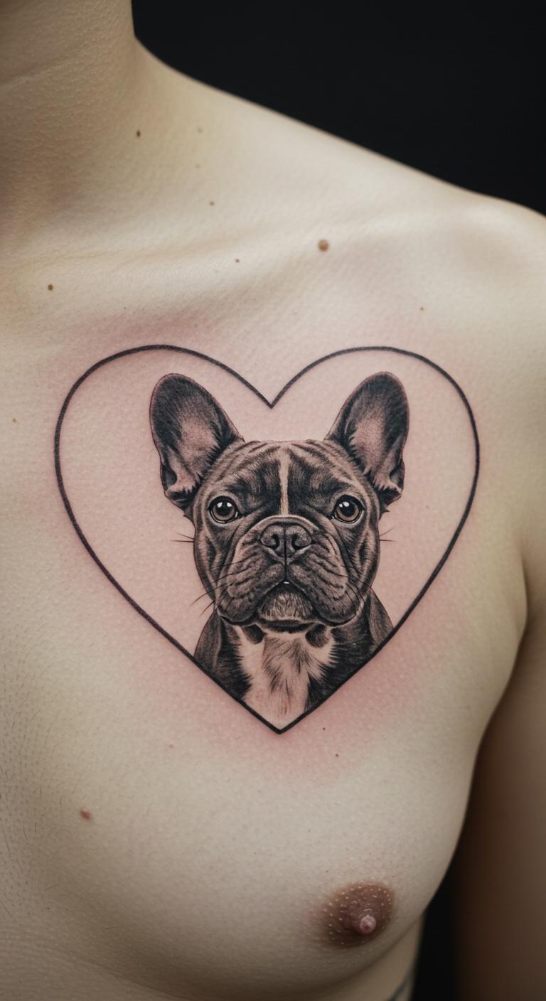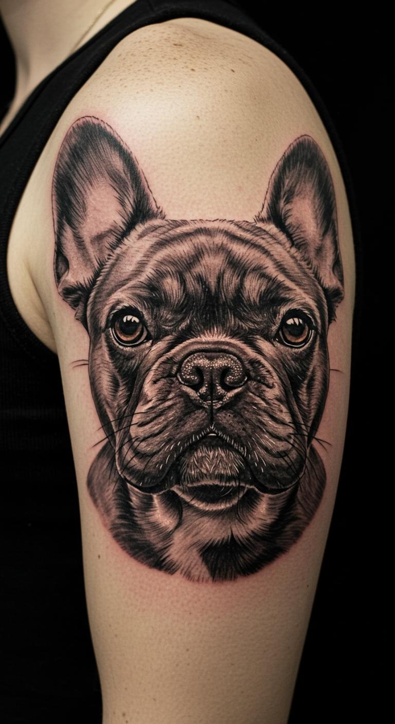 Go for lifelike details to make your tattoo pop. A realistic portrait shows the French Bulldog’s wrinkles and eyes just right. Draw inspiration from pet photos at home. Use a pencil to sketch your dog’s features on paper first. This helps without spending much. Choose spots like your shoulder for a personal feel. Detailed sketches make the process fun. Opt for black and grey ink to mimic a photo. Find budget artists through community forums. Add elements like a paw print for extra meaning. Keep sessions short to cut costs. Practice with temporary tattoos from stores. This style honors your pet in a big way. Size it medium for balance. Try DIY stencils using printer paper and markers. It’s simple and cheap to get started.
