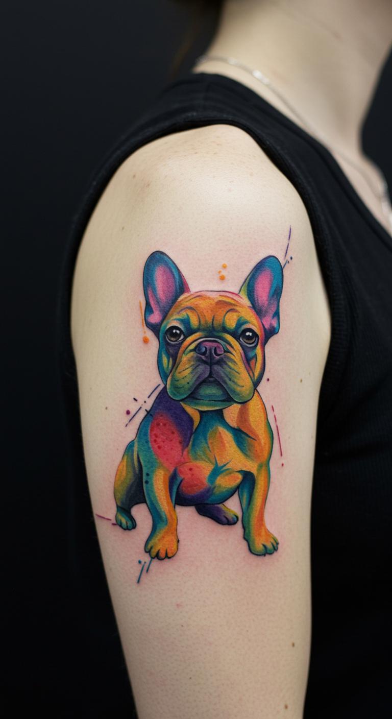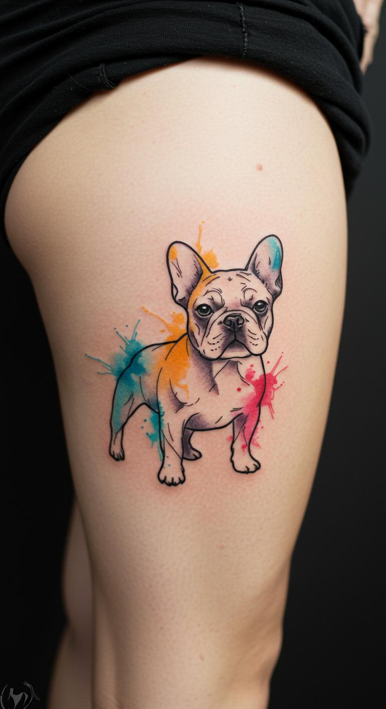 Add color fun with a watercolor effect. This design lets the French Bulldog blend into splashes of blue and pink. Experiment at home with watercolors on paper to plan. Keep it affordable by using kid’s paint sets. Place it on your arm for easy show-off. Color blending tips: start light and layer. Go for vibrant hues to match the dog’s playful spirit. Search local fairs for cheap artists. Combine with simple flowers for more joy. Shorter sessions mean less money spent. Try washable markers for a test run. This idea brings energy to your ink. Aim for a small size to save. Make your own templates with drawing apps on your tablet.