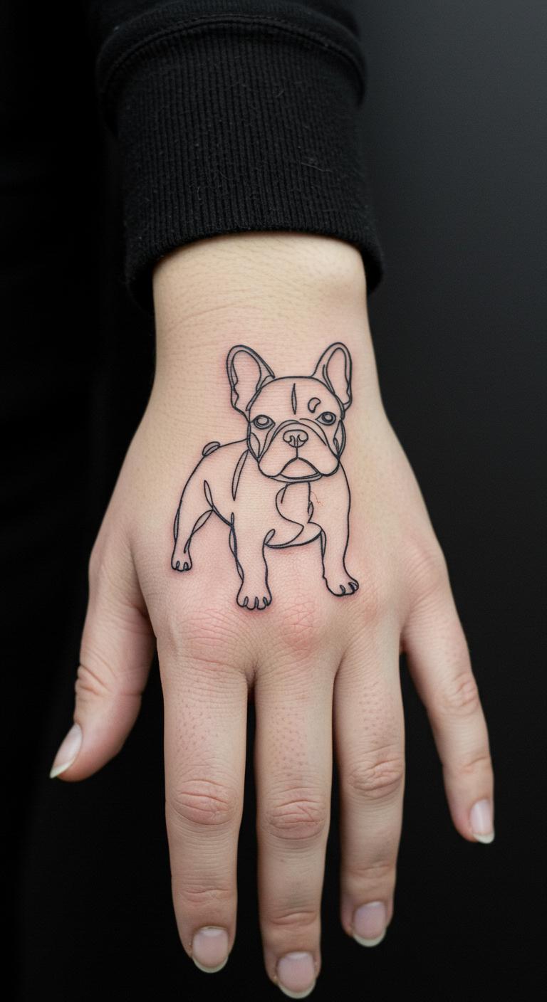 Stick to basic lines for purity. A simple French Bulldog art keeps it elegant. Draw lines on paper with a pen. Quick and cheap. Put on your hand for constant view. Basic strokes are key. Use fine ink. Look for line-focused artists. Add curves for interest. Affordable and fast. Practice with sketches. This design is clean. Go small for impact. Make with drawing pads.