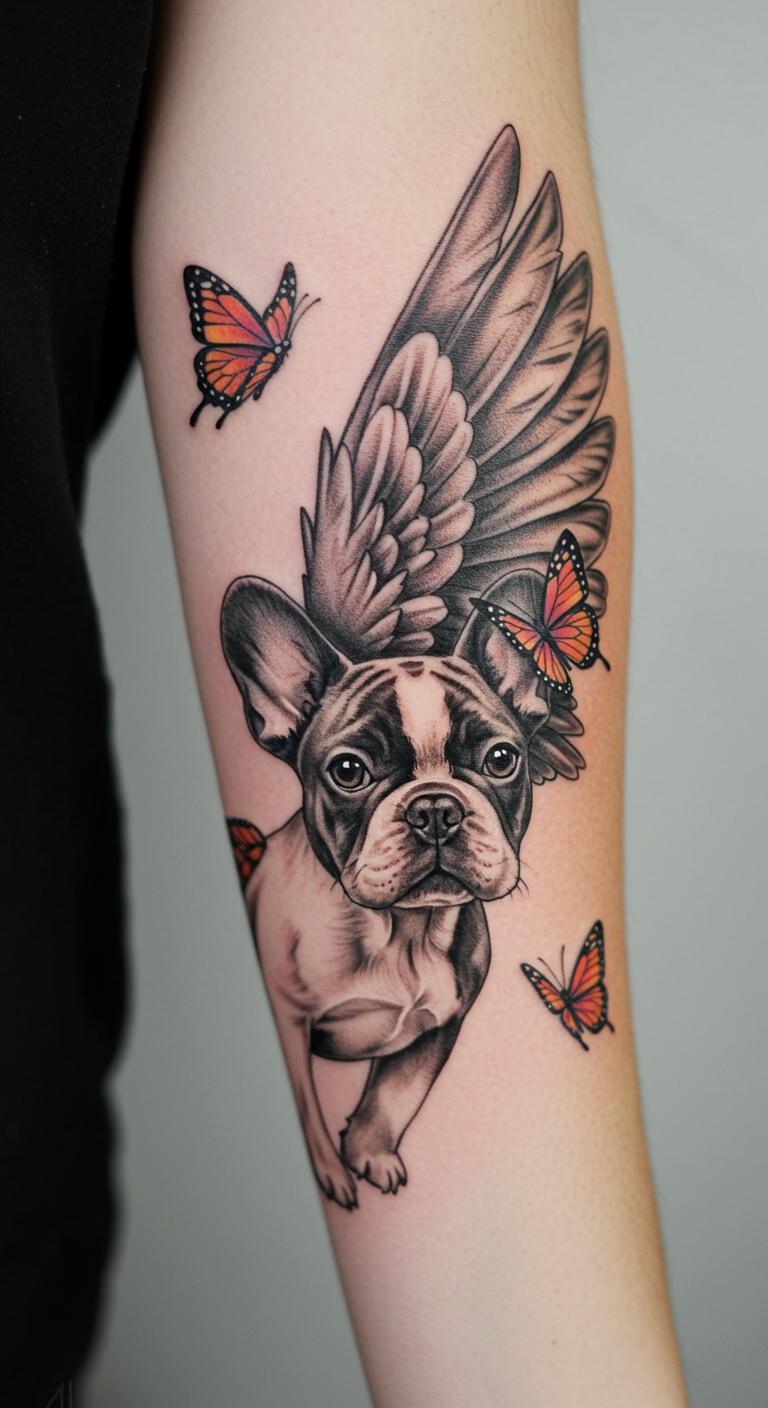 Add butterflies for freedom vibes. Place them around the dog. Sketch butterflies on paper first. Use nature for ideas. Put on your arm for grace. Butterfly wings symbolize change. Choose soft colors. Look for nature-themed pros. Include flight paths. Affordable layering. Practice with drawings. This design inspires. Balance the elements. Make with sketches.