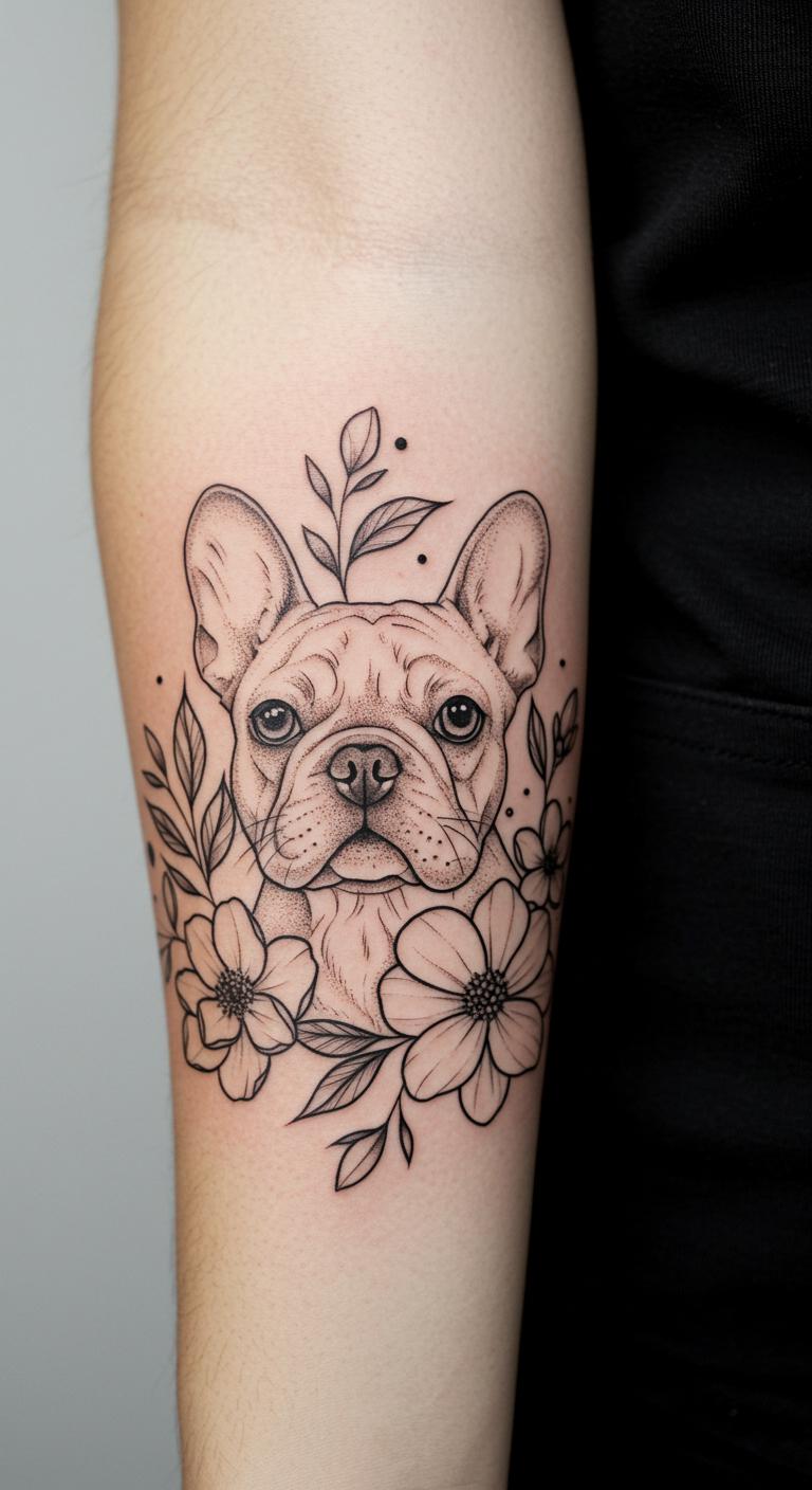 Wrap your French Bulldog in flowers for a sweet touch. This idea pairs the dog with roses or daisies for added charm. Draw flowers around a basic dog shape on plain paper. Use garden sketches for inspiration—it’s free. Place on your ankle for a discreet option. Flower additions make it unique. Opt for colors that pop against the dog. Look for deals at walk-in studios. Include your pet’s name for meaning. Keep the design compact to save money. Test with stickers from home supplies. This brings a positive spin to your tattoo. Aim for balance in size. Make DIY versions with craft markers.