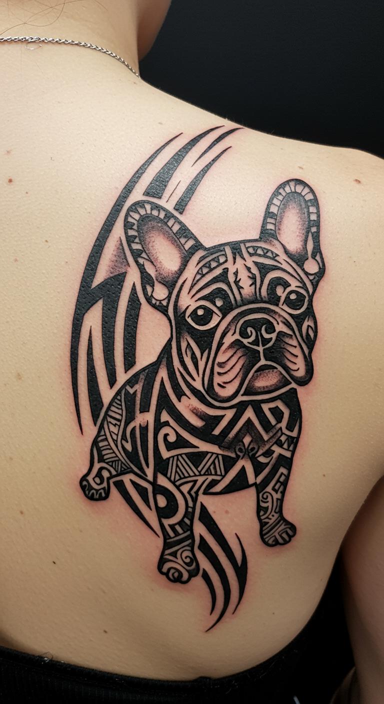 Blend tribal patterns with your French Bulldog for edge. Use geometric lines around the dog’s form. Sketch patterns on cardboard first—super cheap. Place on your back for a bold statement. Geometric twists enhance the design. Stick to black ink for classic feel. Search local events for low-cost artists. Add cultural elements if they fit your story. Divide into multiple sessions to manage expenses. Practice with free online templates. This style adds depth to your ink. Keep it medium for practicality. Make simple versions with ruler and pen.