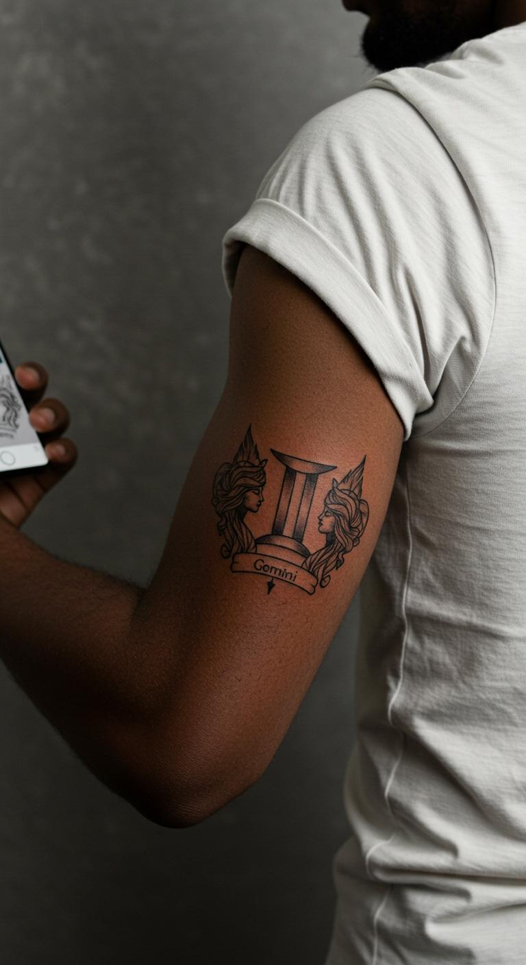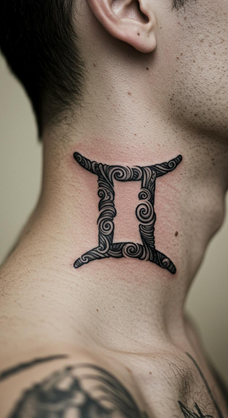 Picture a basic Gemini glyph tattoo with two interlocking shapes. This design uses clean lines to capture the twins’ essence. Start small on your wrist for less pain. Think about black ink only to keep costs low. A budget tip: Sketch it first with a temporary marker from a dollar store. DIY example: Use henna kits under $10 to test the look at home. Add a personal twist, like a tiny dot for your birth year. Keep it simple. This idea works for anyone. Go for professional artists charging $50–100 for small pieces. Experiment alone if you’re artistic. Focus on what feels right for you.
